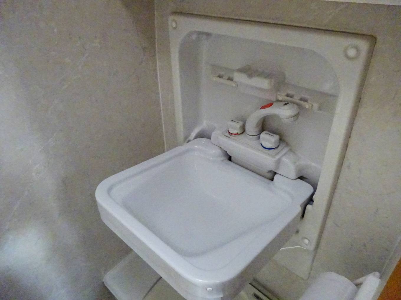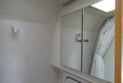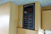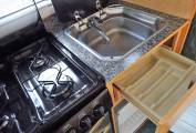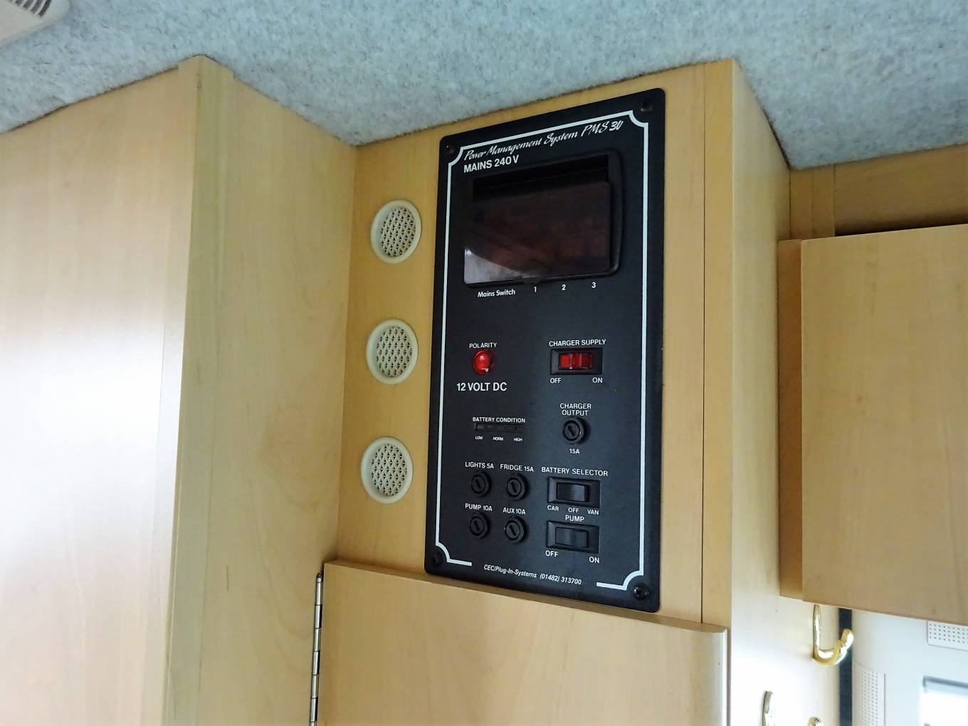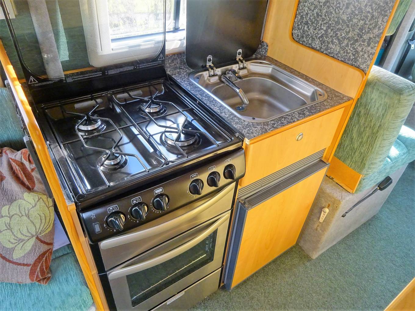 There is a central kitchen with full oven, 12v fridge and sink. Also a mid positioned washroom with shower, basin and cassette toilet.
