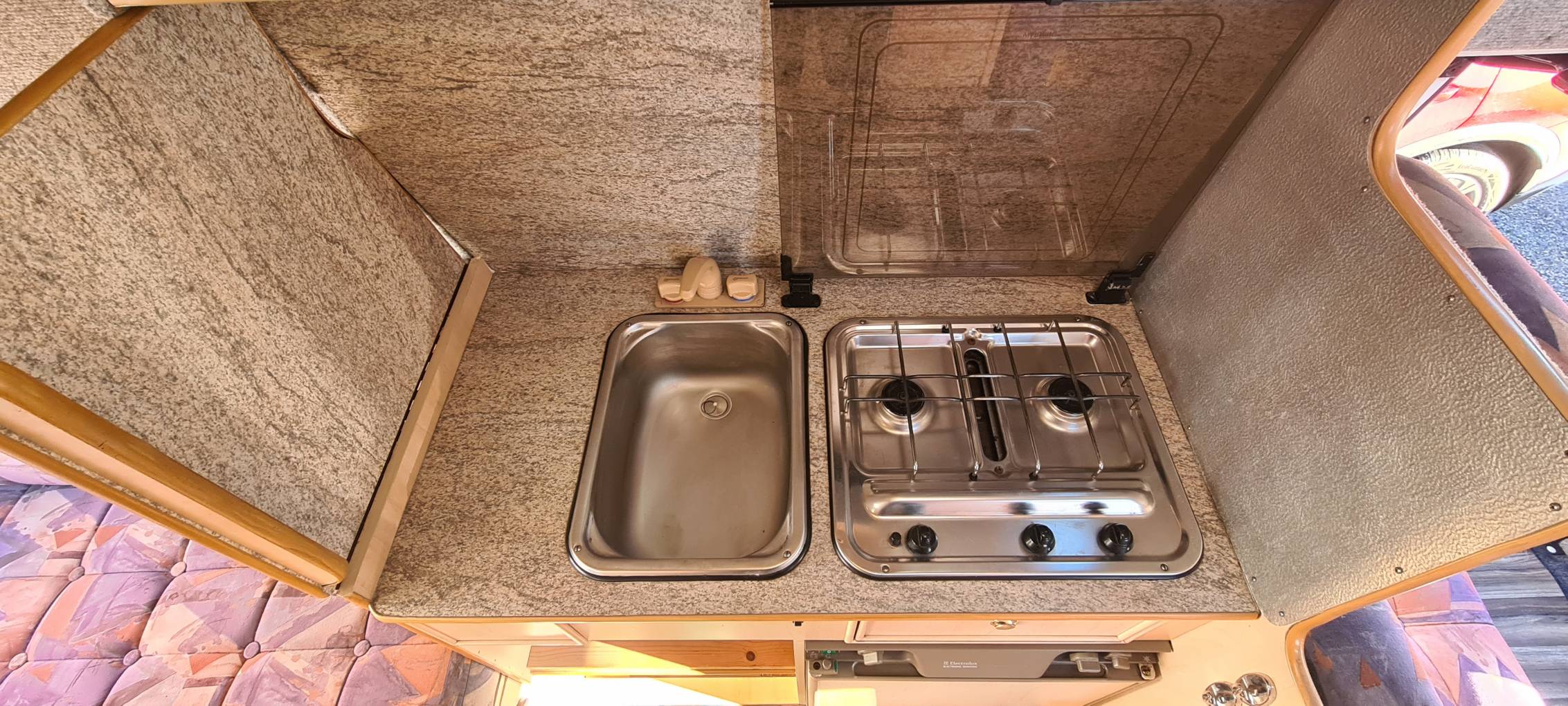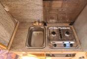 The kitchen is neat and tidy with a sink and tap, which can be covered with the chopping board when not in use. A gas burner hob with 2 rings, a 3 way Electrolux fridge and plenty of space for storing pots and pans.