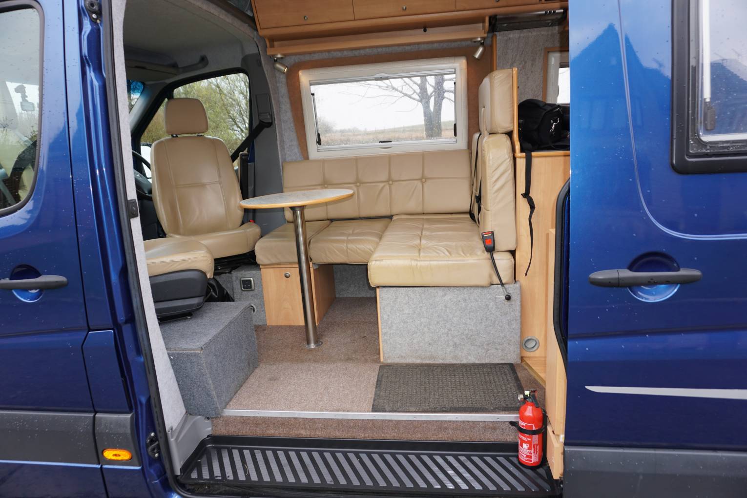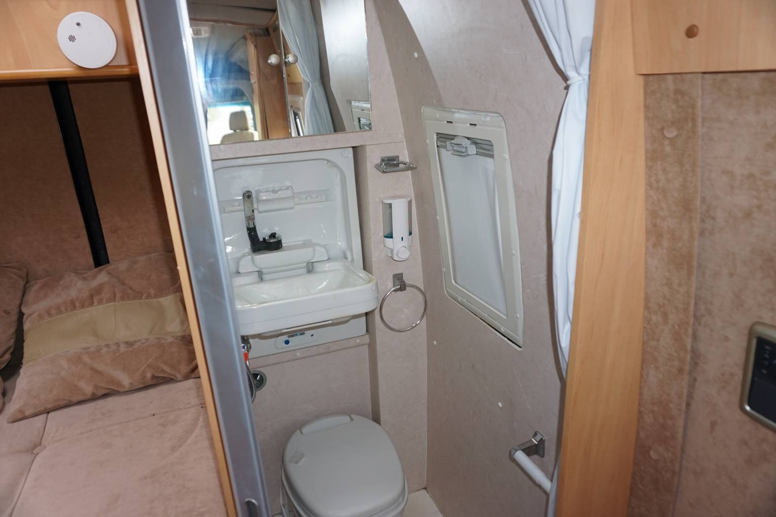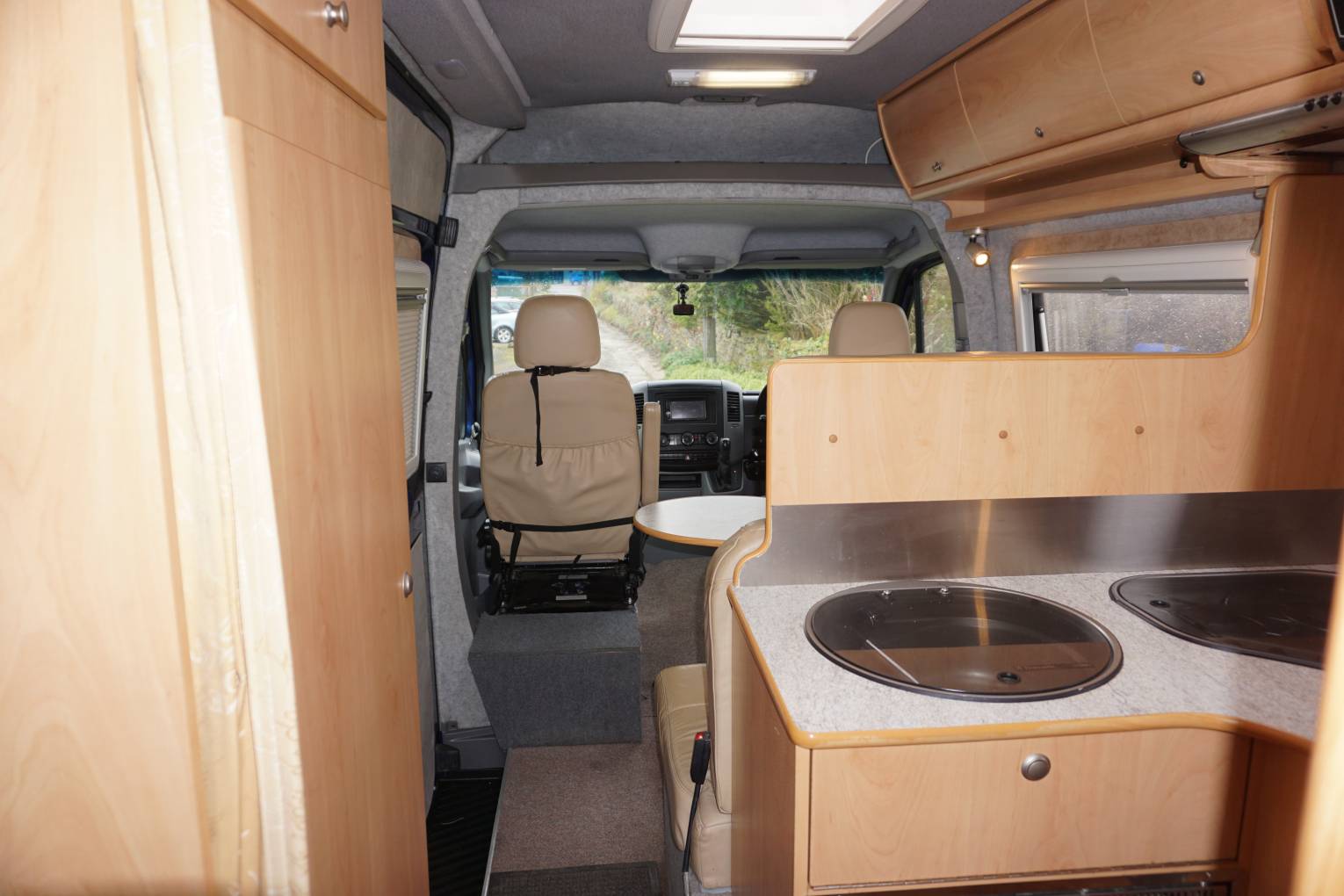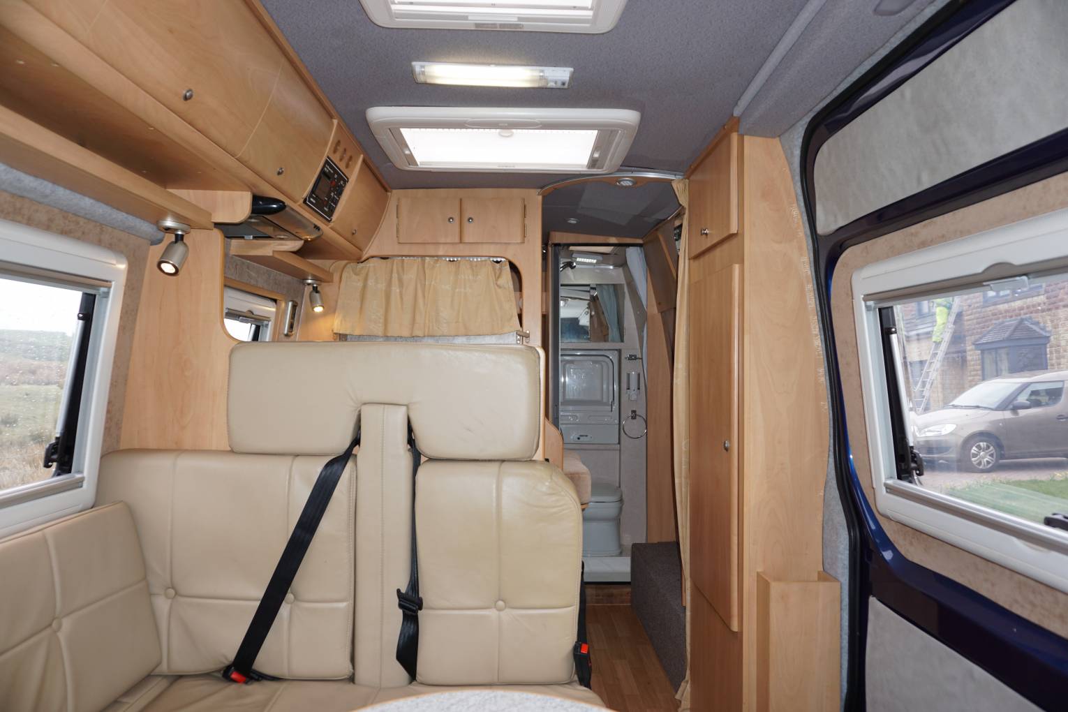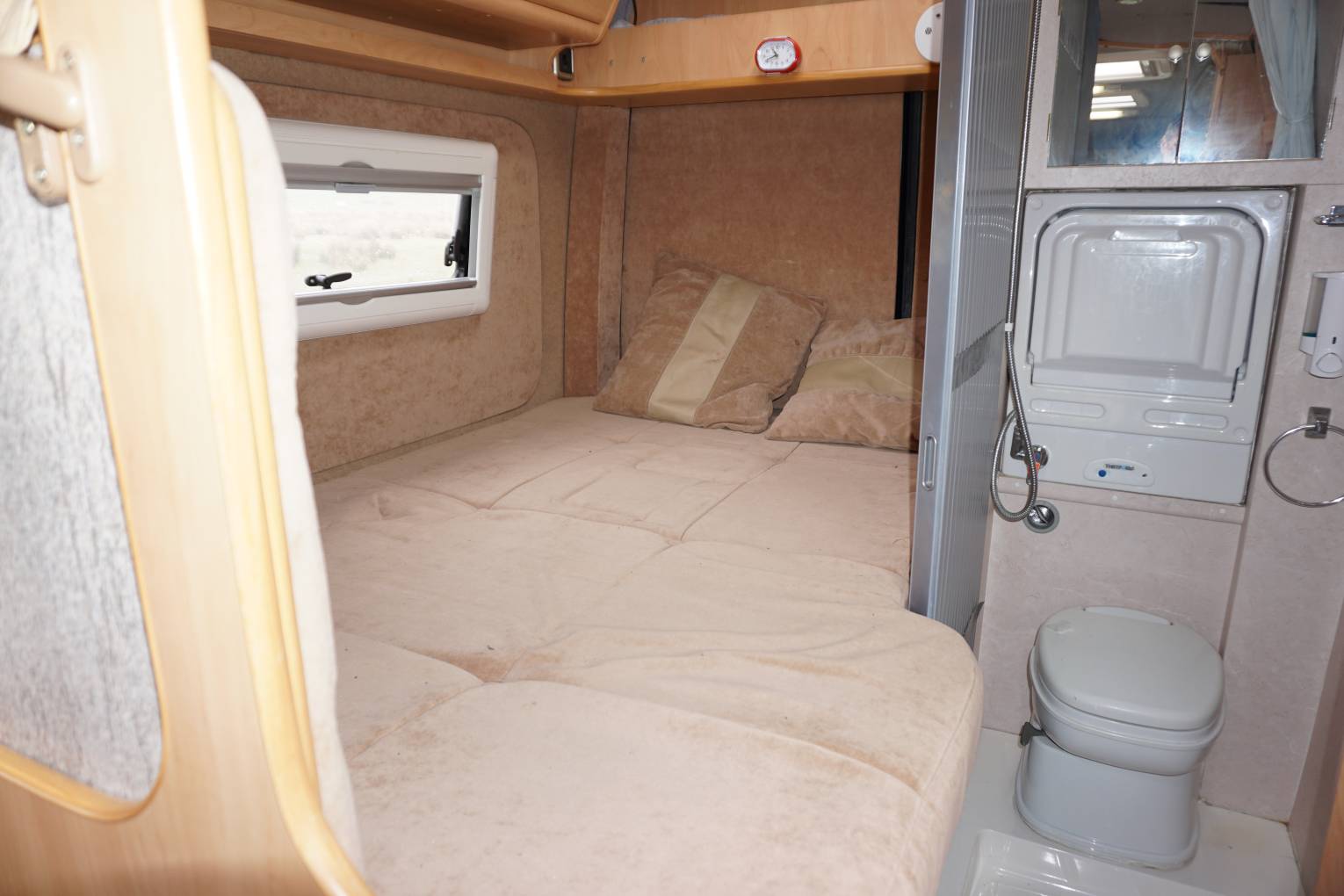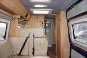 The front of the vehicle boasts full leather trim – on both cab seats and the L-shaped settee. There’s a flat screen TV as standard too, positioned for viewing in the lounge but removable so that it can be clipped into place in the bedroom too. A directional TV aerial is also fitted, as are cab blinds and concertina-type blinds in the living area.