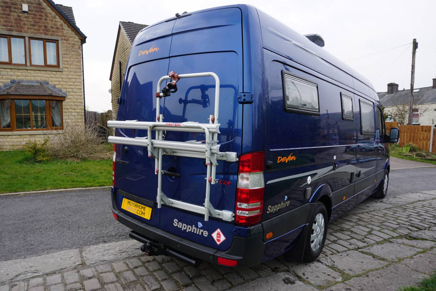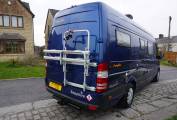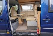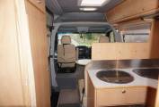 I present this wonderfully equipped Devon Sapphire Van conversion. Chief amongst the Sapphire’s features is a longitudinal double bed at the rear with the bathroom alongside. The 6ft 4in double sits on a slatted base and covers a huge storage area that’s accessible through the twin rear doors. Above the bed, the LED lights have a dimmer switch, while full-height curtain can shut off the whole bedroom/bathroom area for privacy.