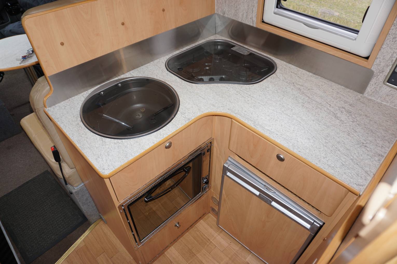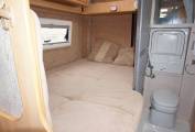 The corner washroom has a swivel cassette loo and a fold-down basin. A tambour door makes for easy access and there’s just enough space for showering. Further forward, the L-shaped kitchen includes a Cramer three-burner hob, placed in the corner to free up extra worktop space adjacent to the mains socket – perfect for the kettle. Also fitted are a Dometic cooker hood, Waeco 65-litre compressor fridge and a Smev oven/grill, while the screen between bedroom and kitchen has a folding panel that creates lots more useful worktop for the chef. Gaslow system for economical cooking and heating with ease of re-filling