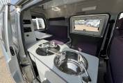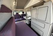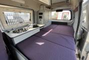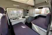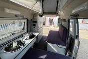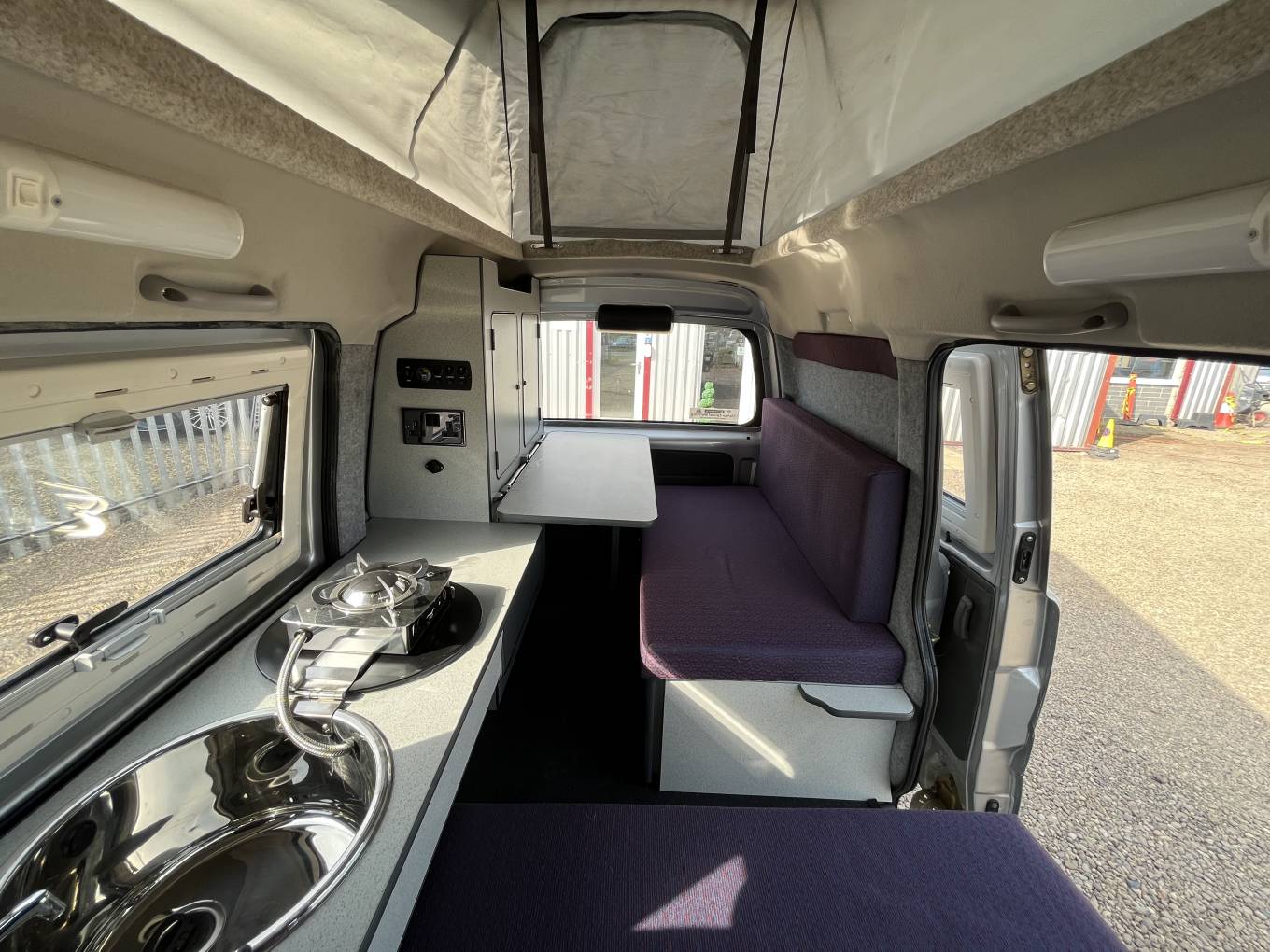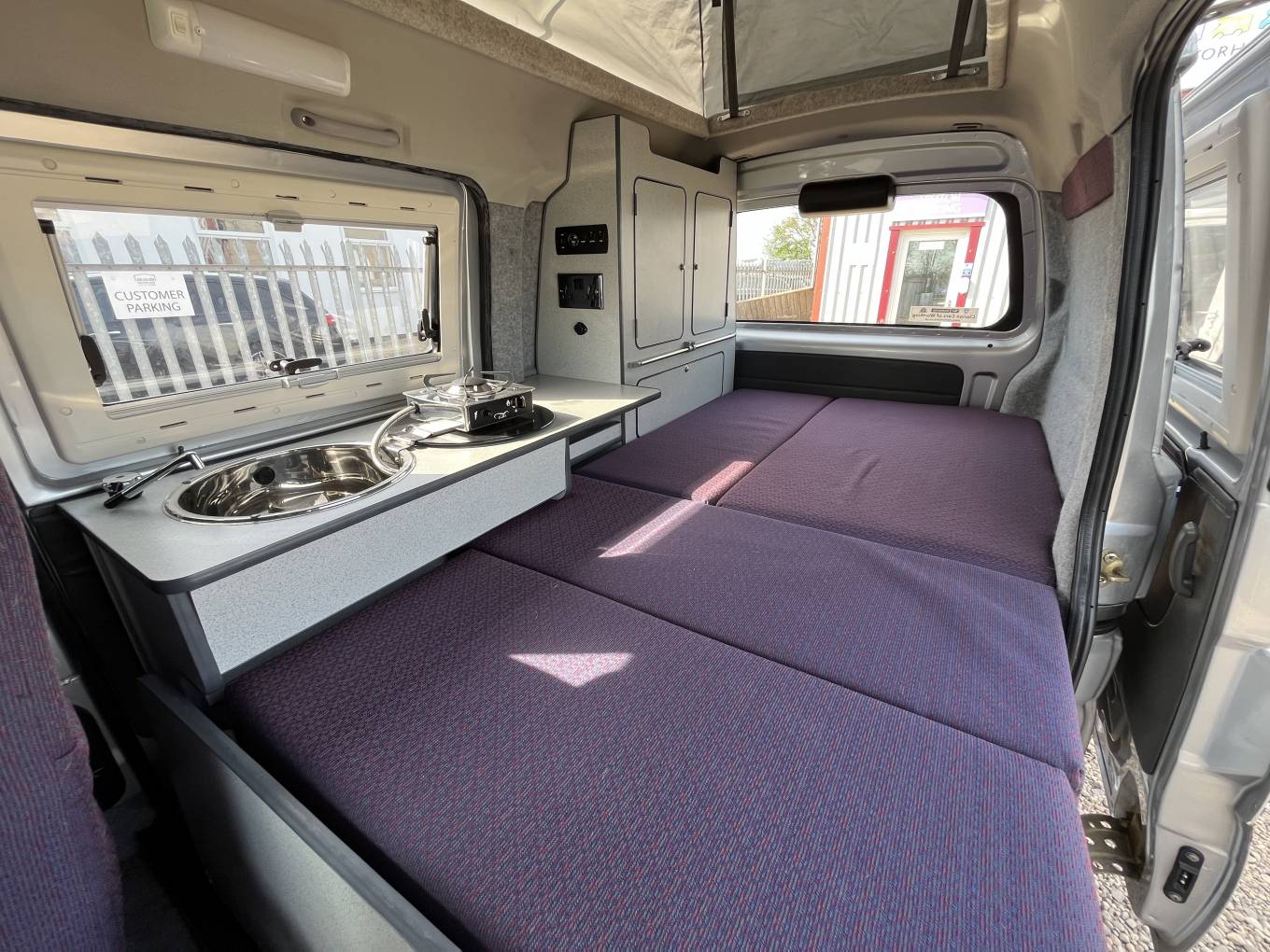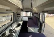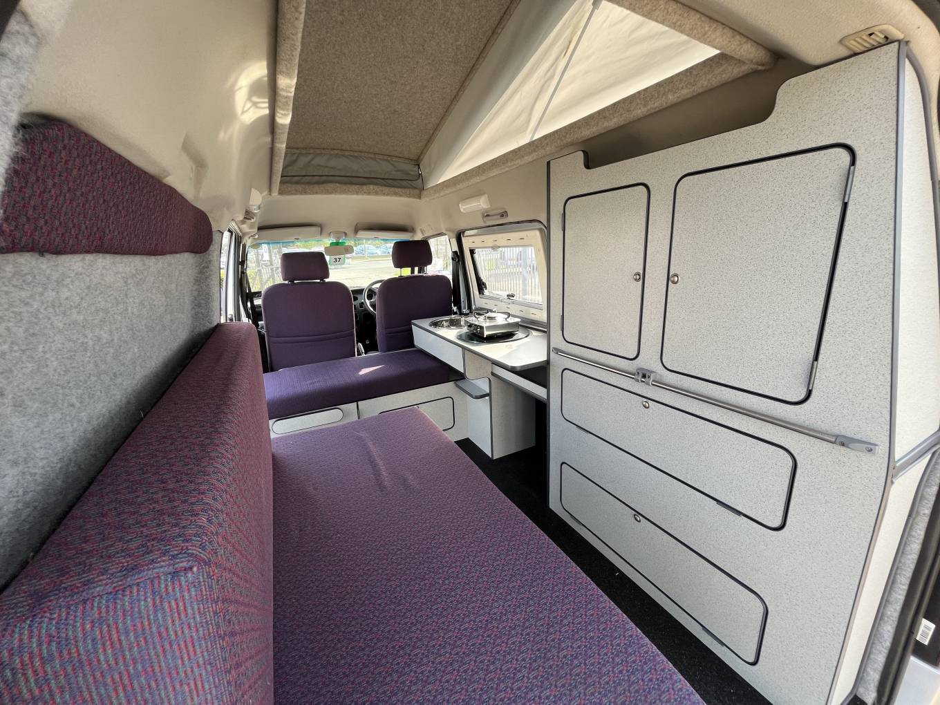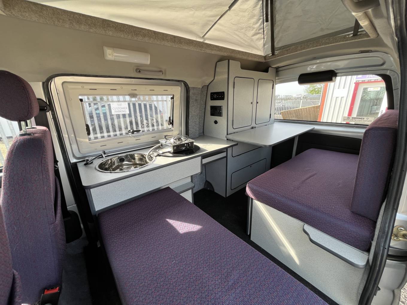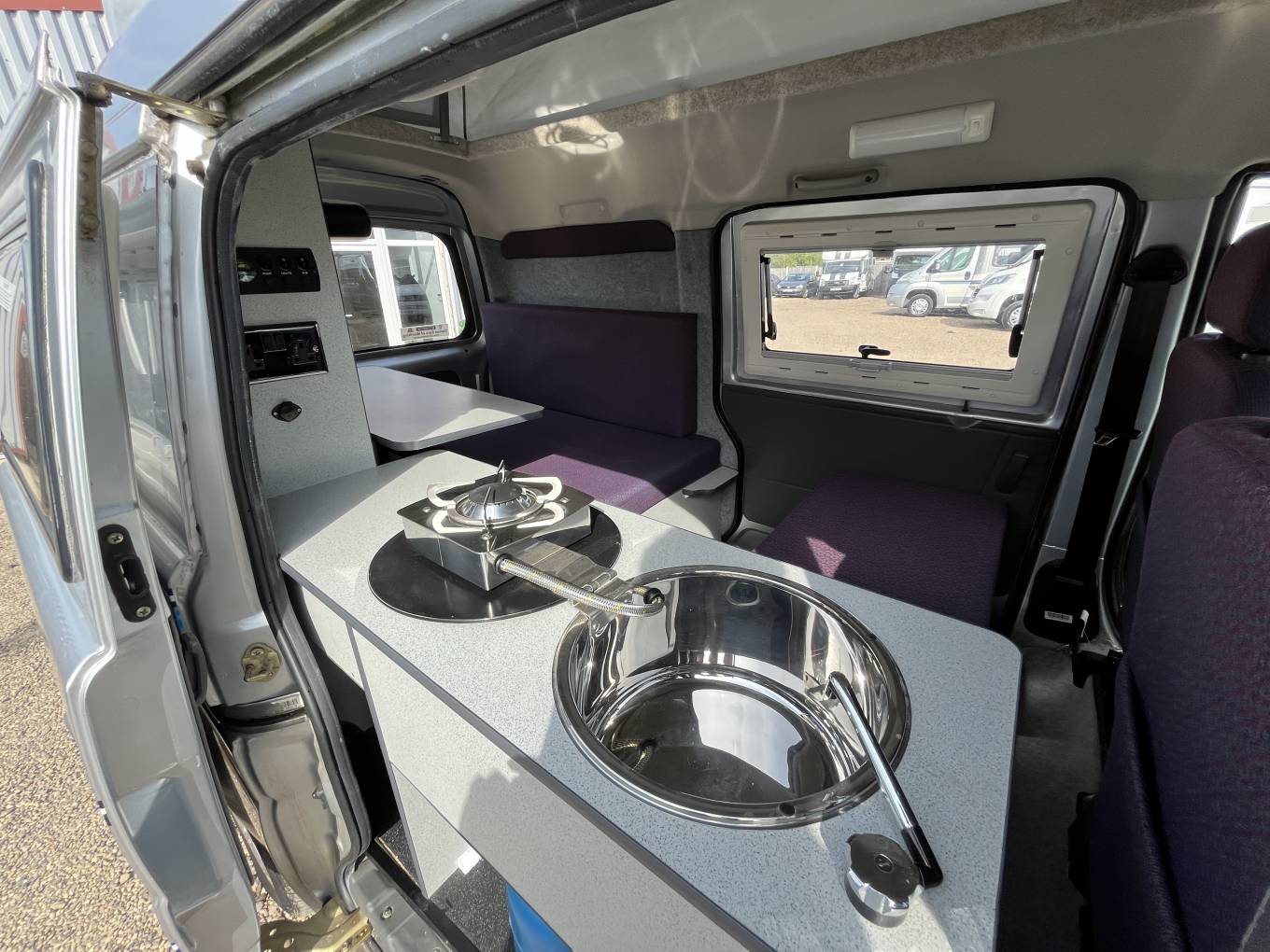 This micro-camper has seen only light use, which is evident not only in the low mileage but excellent condition both internally and externally. The Cutie has two sliding doors on either side as well as rear access. Its pop-top roof provides a full height interior, making manoeuvring inside the camper much easier. Being the minimalistic camper that it is, cooking facilities are modest, consisting of a gas hob and sink with room for a mini fridge. The open seating area is focused around the fold away table which clips onto the wall with ease, granting ample room for up to three adults to eat, drink and entertain. This space can be transformed into a small double bed that measures approx. 6ft by 2.5 ft by cleverly using the back rest cushions with a solid backboard to create a base for the bed in as quick as 30 seconds.