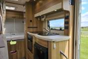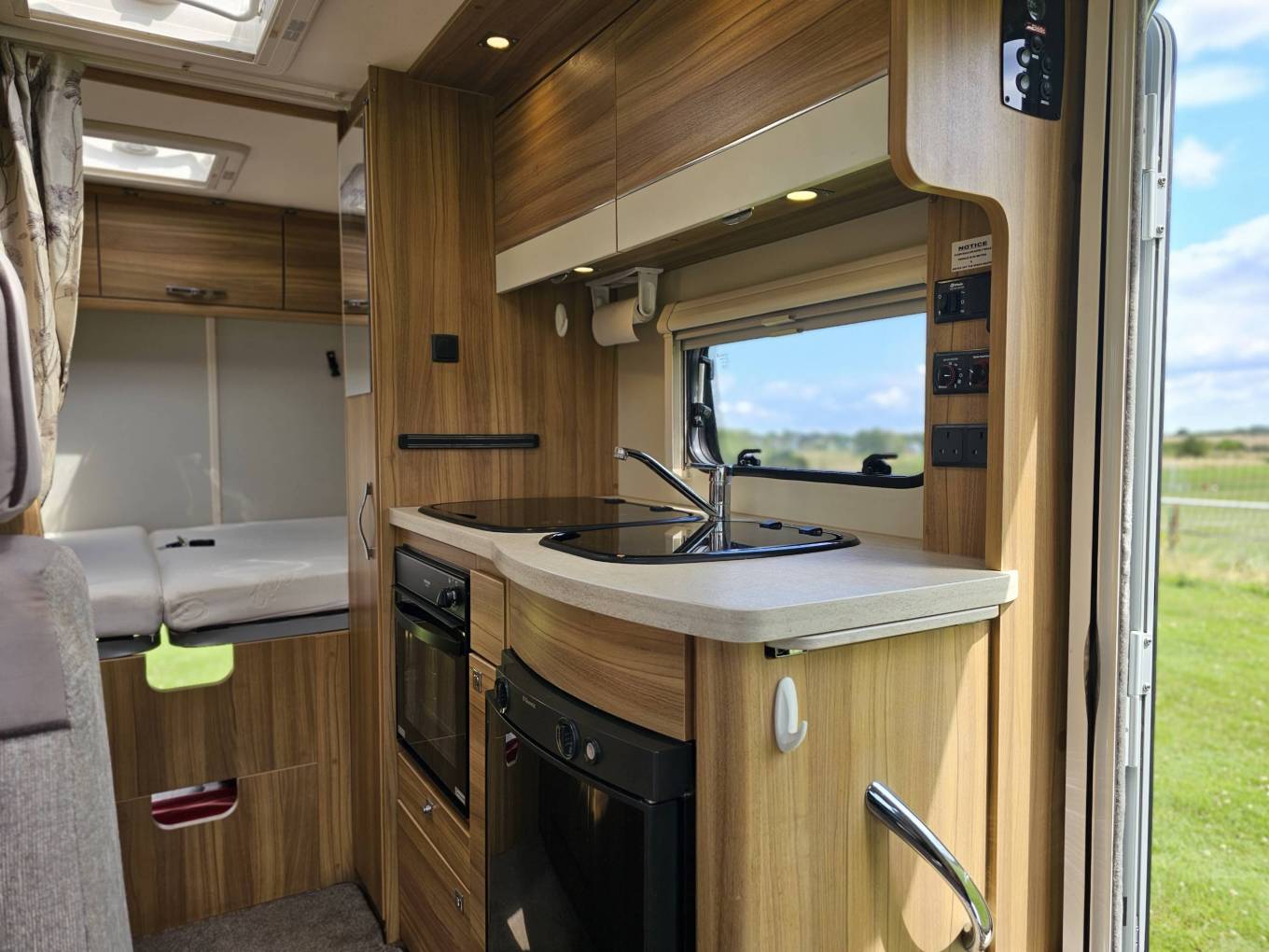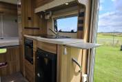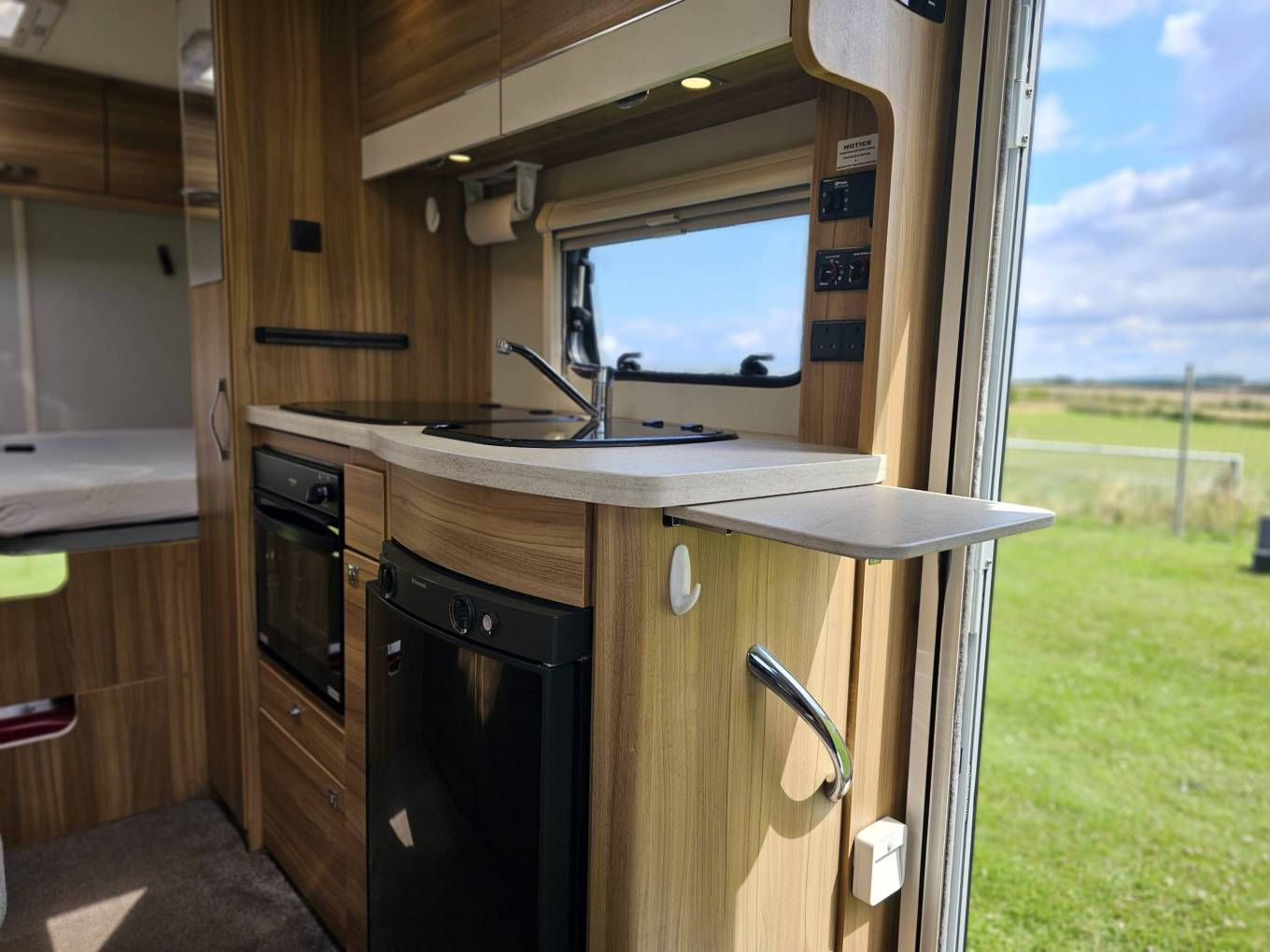 There is a small kitchen galley with extending worktop adjacent to the habitation entrance door. In this is a oven/grill and 3 ring hob as well as a good sized sink. Power is provided above at eye level.