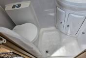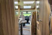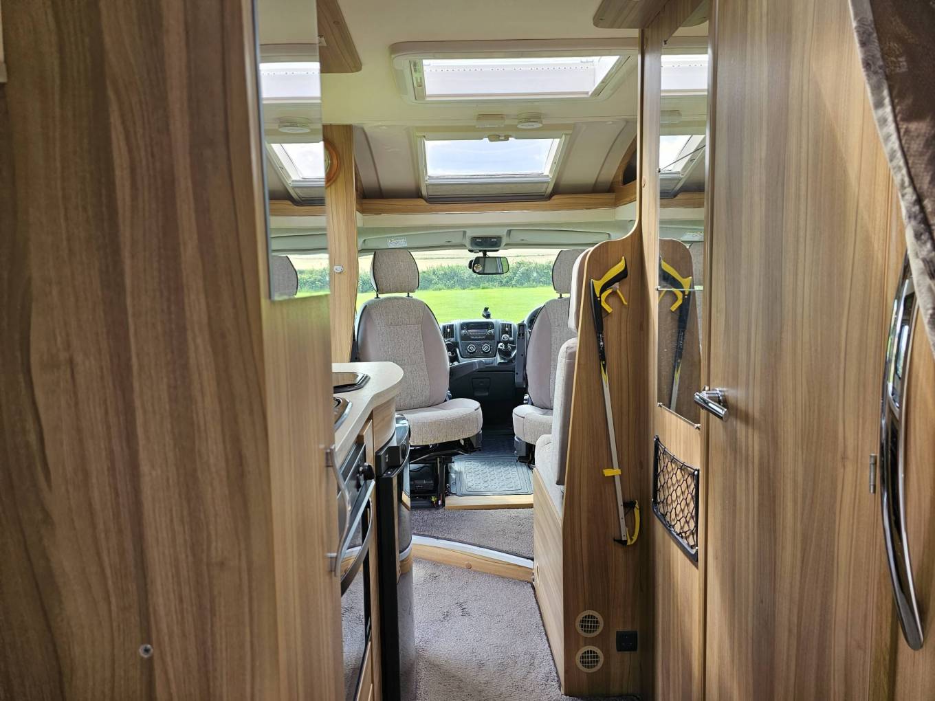 The rear garage is accessed via the large lifting door on the back of the motorhome which is kept in a raised position by the handy clip[/retainer bracket above. Inside the space provided is deceptive and there are lashing points, drawrs and a large cupboard that houses the fuse board as well as providing additional storage space. The habitation side has a removable wall sat under the bed that lifts out in 2 pieces to provide more room for longer objects or somewhere to provide safe space for pets while you sleep above as an example.