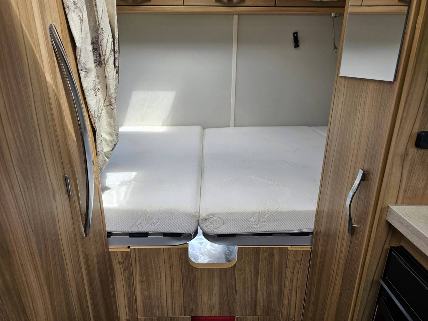 Lastly we come to the above garage transverse bed that lifts and fastens in two sections to provide space below when not in use. This is surrounded by several eye level cabinets and LED reading lights