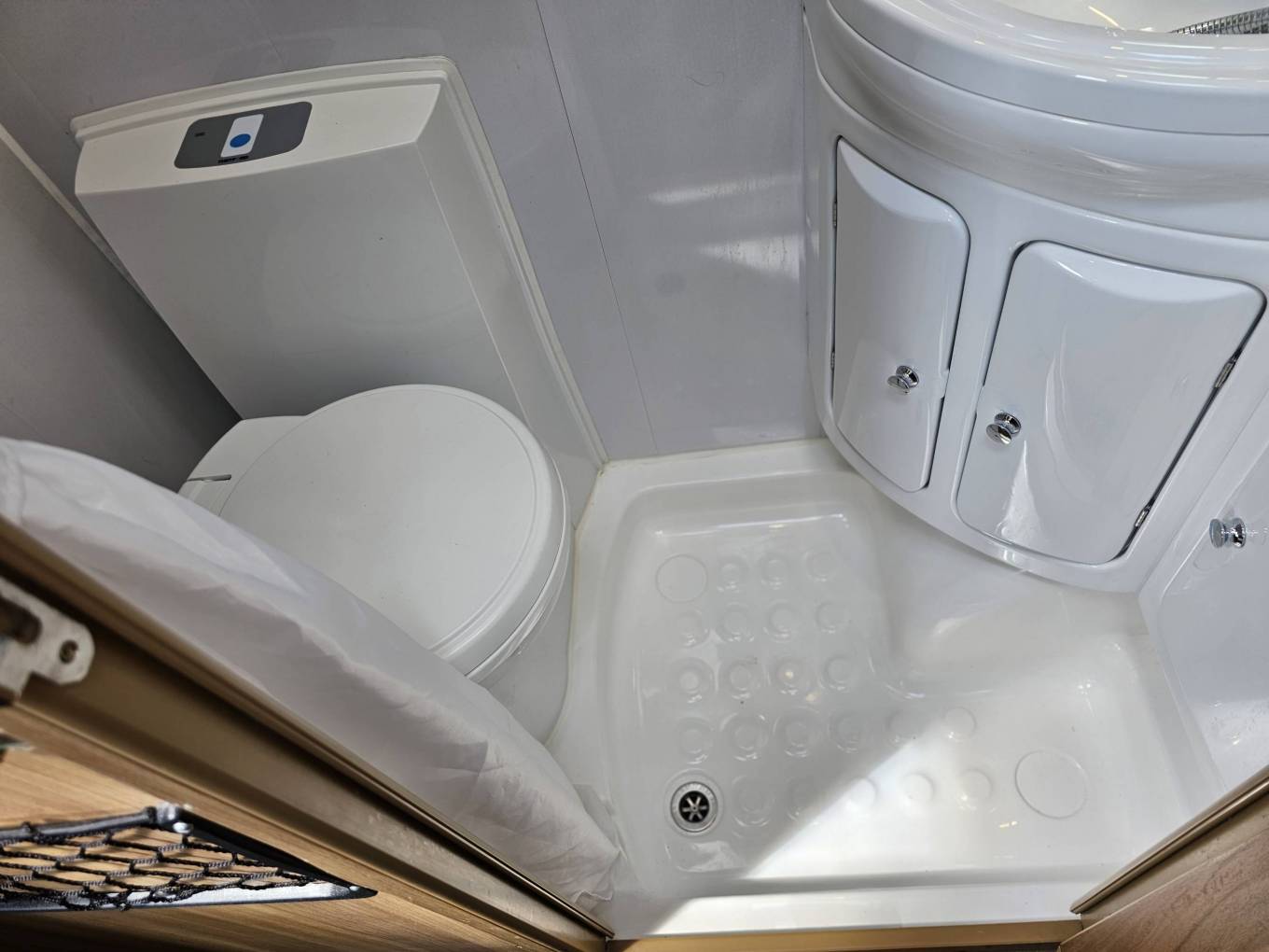 Opposite the wardrobe is the small but perfectly formed bathroom with mirrors, shower, sink, toilet and vanity cabinet