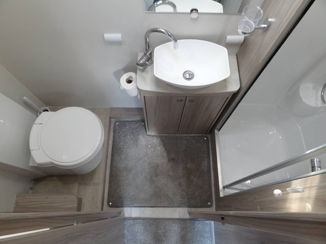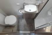 Starting at the rear, you have the highly desirable rear washroom which includes a Thetford cassette toilet, modern washbasin with mixer tap, a good sixed a mirror and a separate full length shower along with plenty of storage cupboards too,