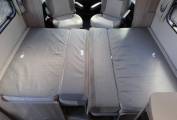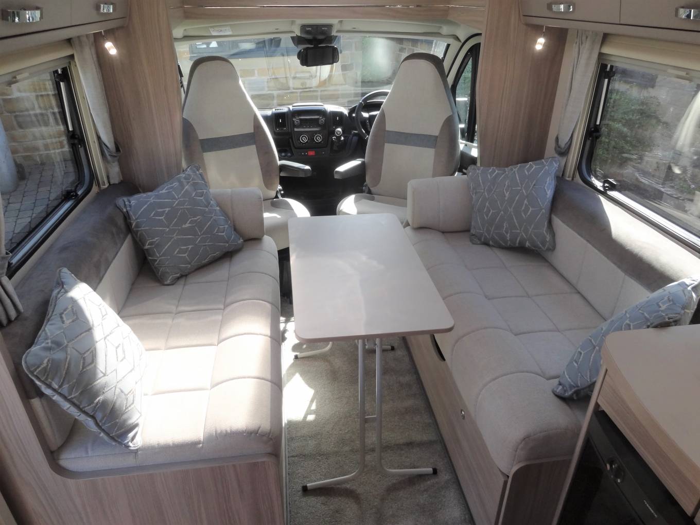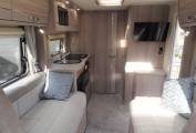 One of the beauties of this Elddis range is the interior feeling of space, partly due to the front swivel seats but equally due to the use of furnishings and fabrics that offer that luxury feel as well as the large windows and roof lights that flood the motorhome with natural light. As we come to the centre lounge, there is a single sofa down each side that slide out to make the extremely large double bed. There is also plenty of storage space in the over head cabinets along each side.