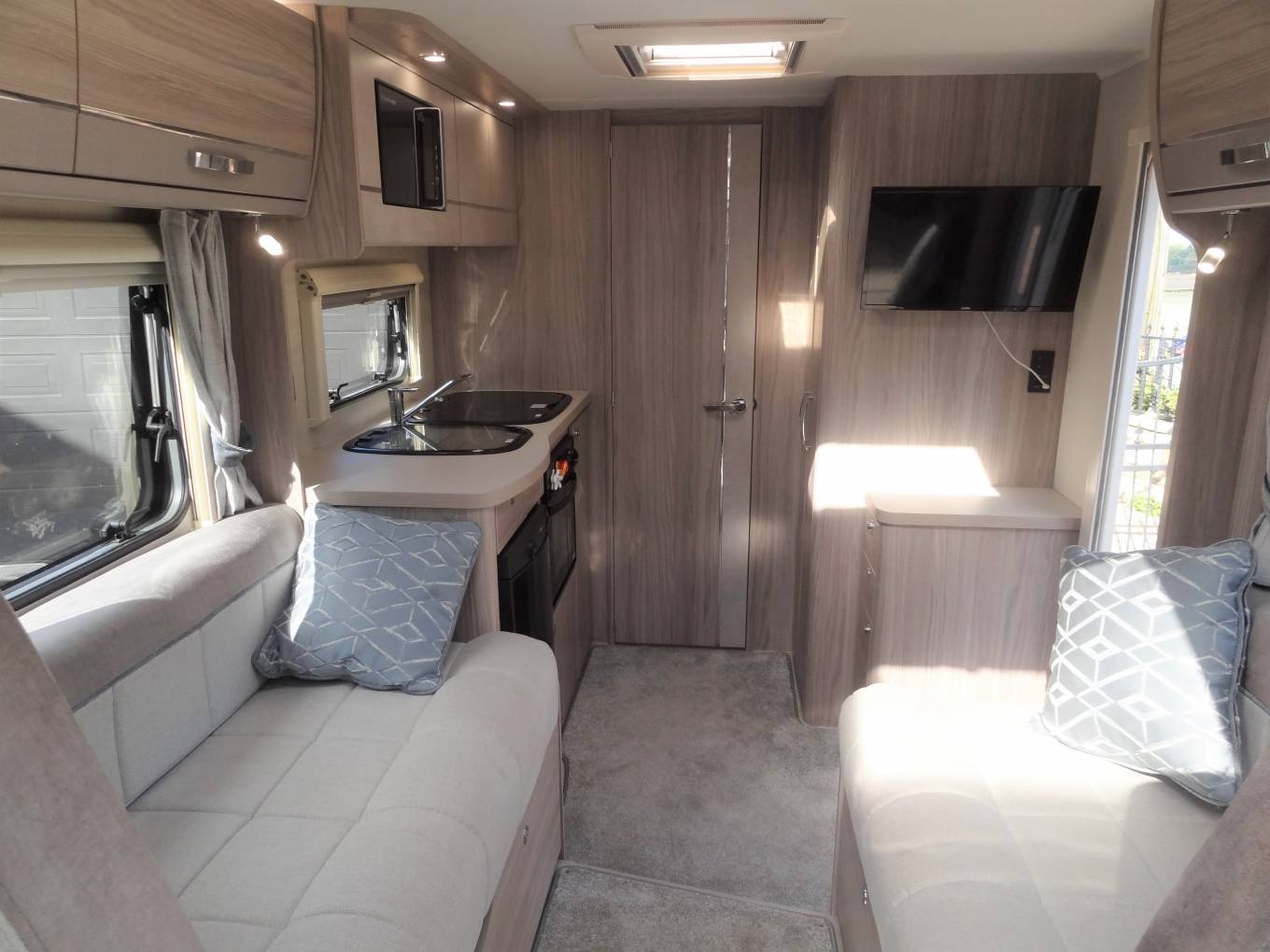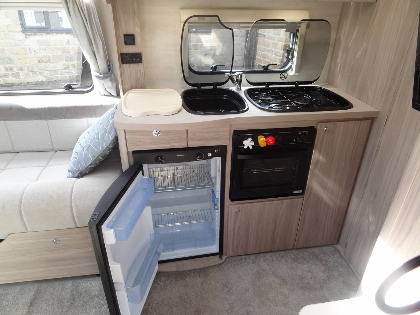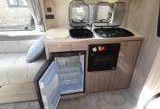 Moving through the motorhome we have the kitchen where there is a Thetford Caprice Oven with a grille and 3 ring gas hob, sink with mixer tap, large Dometic fridge with freezer compartment, state of the art Russell Hobbs microwave. Opposite the kitchen is a large wardrobe and further storage units.