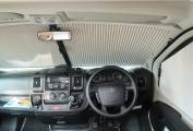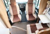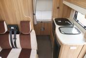 Behind this is the lounge dinette consisting of a forward facing two seater sofa finished in a stylish cream and brown fabric and fitted with two seat belts. There is a small drinks table on a swing arm or if you prefer a larger dining table can be used. At night time this area converts into a single bed making use of the driver's swivel chair. A large skylight above the lounge plus another one above the driver's cab ensures that this area is flooded with loads of natural light making it a lovely spot to relax in.