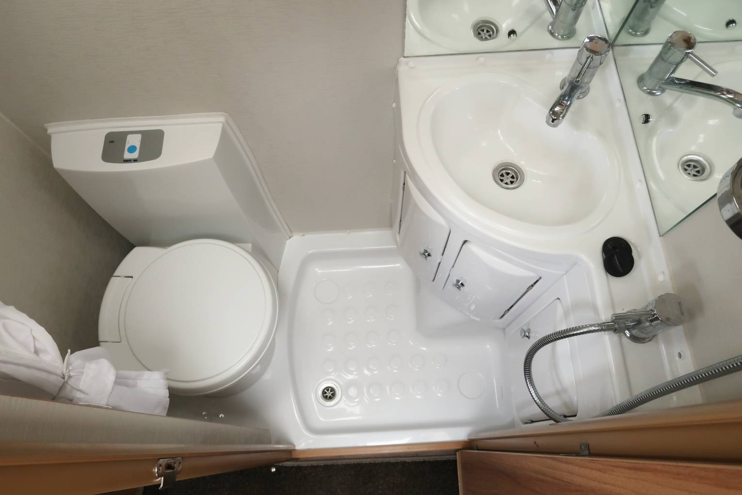 The mid-kitchen has all the facilities you should need to rustle up a lovely meal or two on your travels. There is a 3 gas burner hob, a gas oven and grill, a generous sized 3 way fridge, a sink with a mixer tap and plenty of storage space in the lockers and cupboards. Also located centrally is the washroom which has a shower, a cassette toilet, a wash basin and mixer tap, a mirror and a bathroom storage unit.