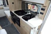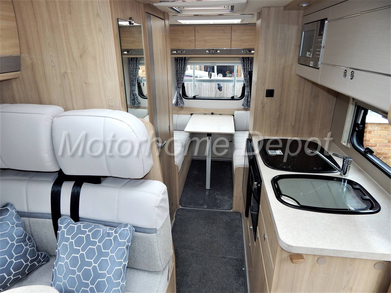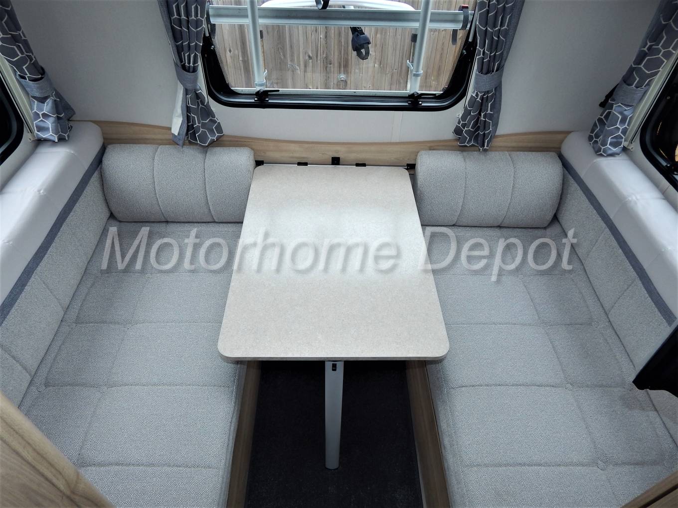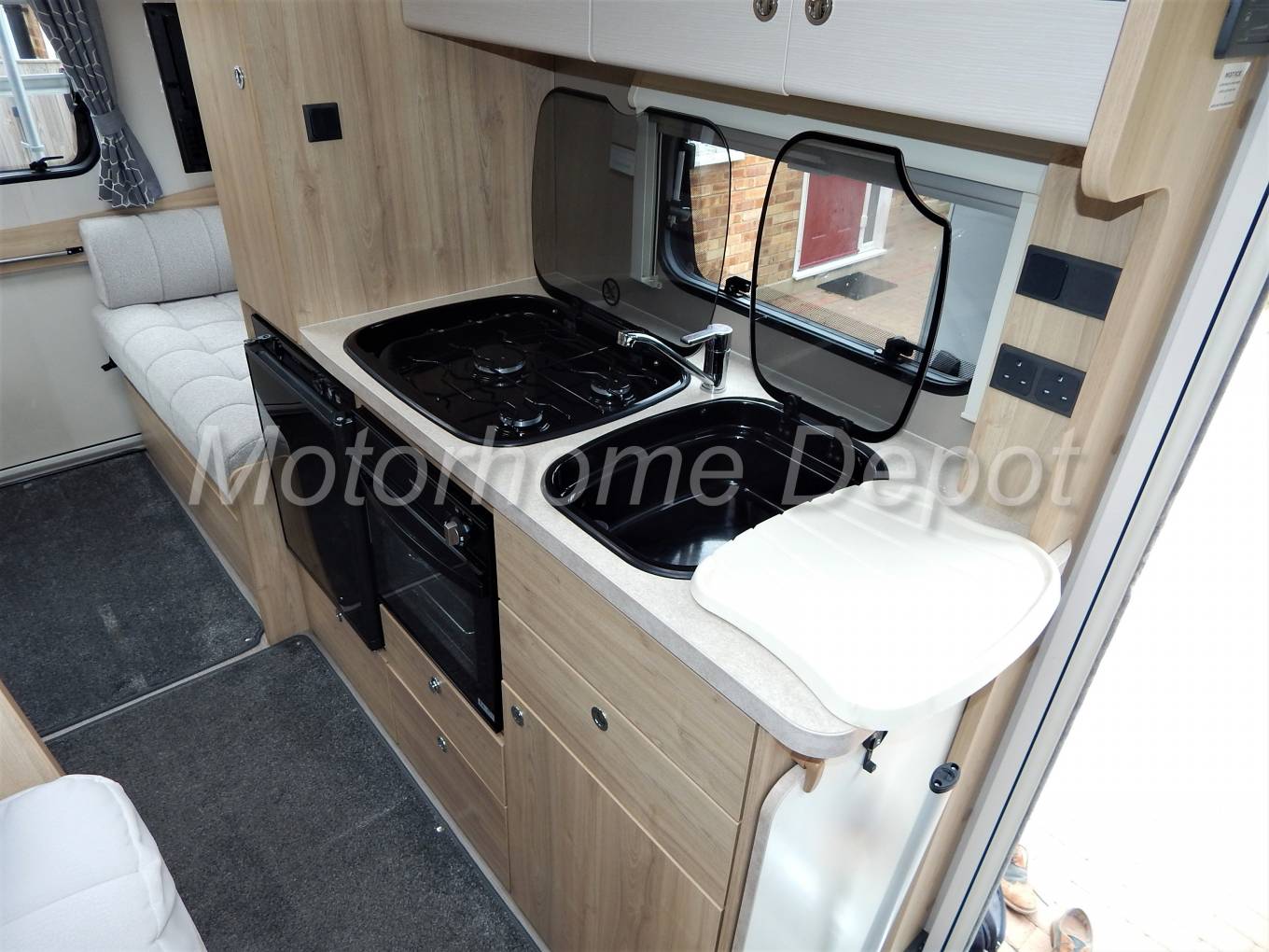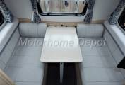 The Kitchen immediately to the right of the habitation door consists of a 3 burner gas hob black enamel style sink with chrome mixer tap, Thetford Duplex oven & grill. There is a Dometic 3 way fridge with ice box that can be powered by 240v; 12v; or gas depending if your plugged in on site or wild camping. Above there is a Daewoo Microwave & plenty of cupboard space for all your cooking utensils.
