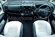 We enter the motorhome on the passengers side Immediately in front of you are the two additional traveling seats which has a small coffee table where you can turn the front seats to join this area if taking a break on your travels. This also makes up in to a small single bed for a child or small adult.