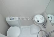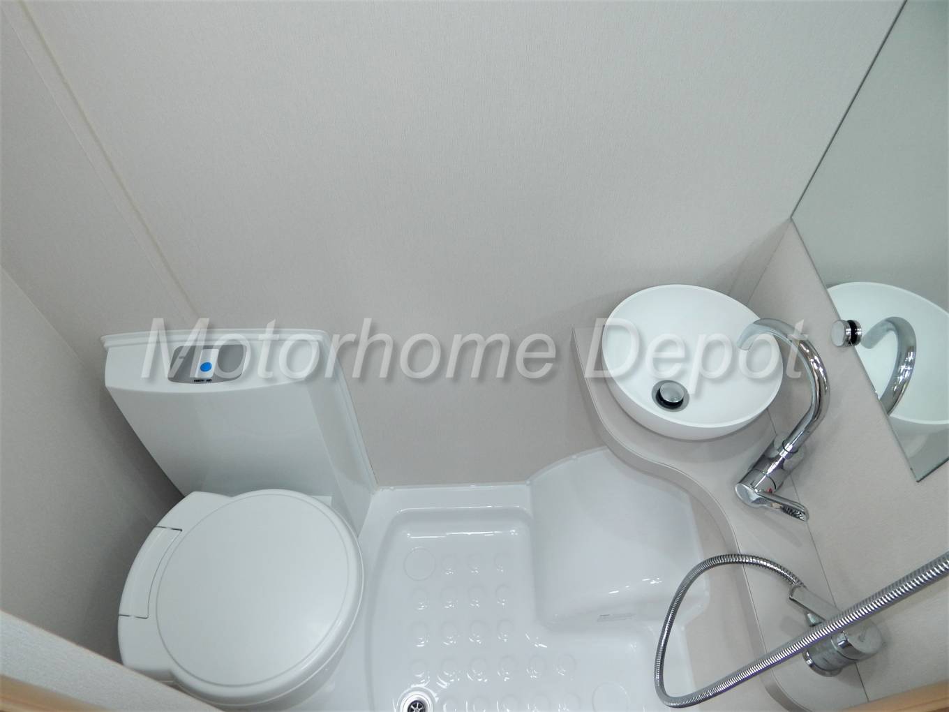 The bathroom is a wet room style with a Thetford swivel head fresh water flush toilet modern bowl style sink with chrome mixer tap mirror above.