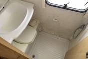 The washroom has a fold down sink, shower and a Thetford bench flush cassette toilet.