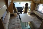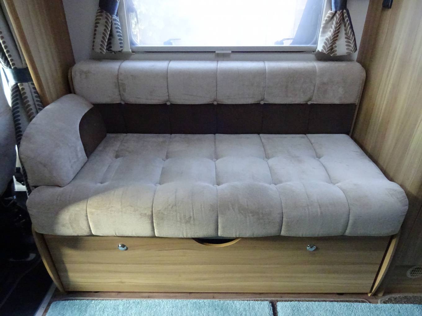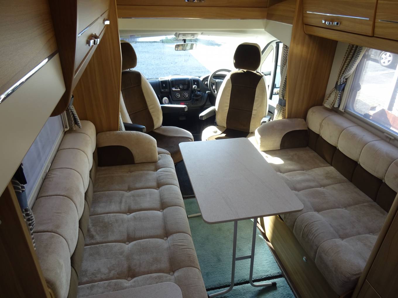 Moving up, we have a good size wardrobe with table storage. Opposite this is another unit, with worktop, cutlery drawer, storage above and below. The lounge is symmetrical, has parallel sofas and more storage above and below. The bed can be set up in a flash, and the fold away table makes a great diner.