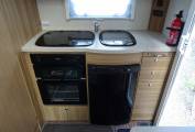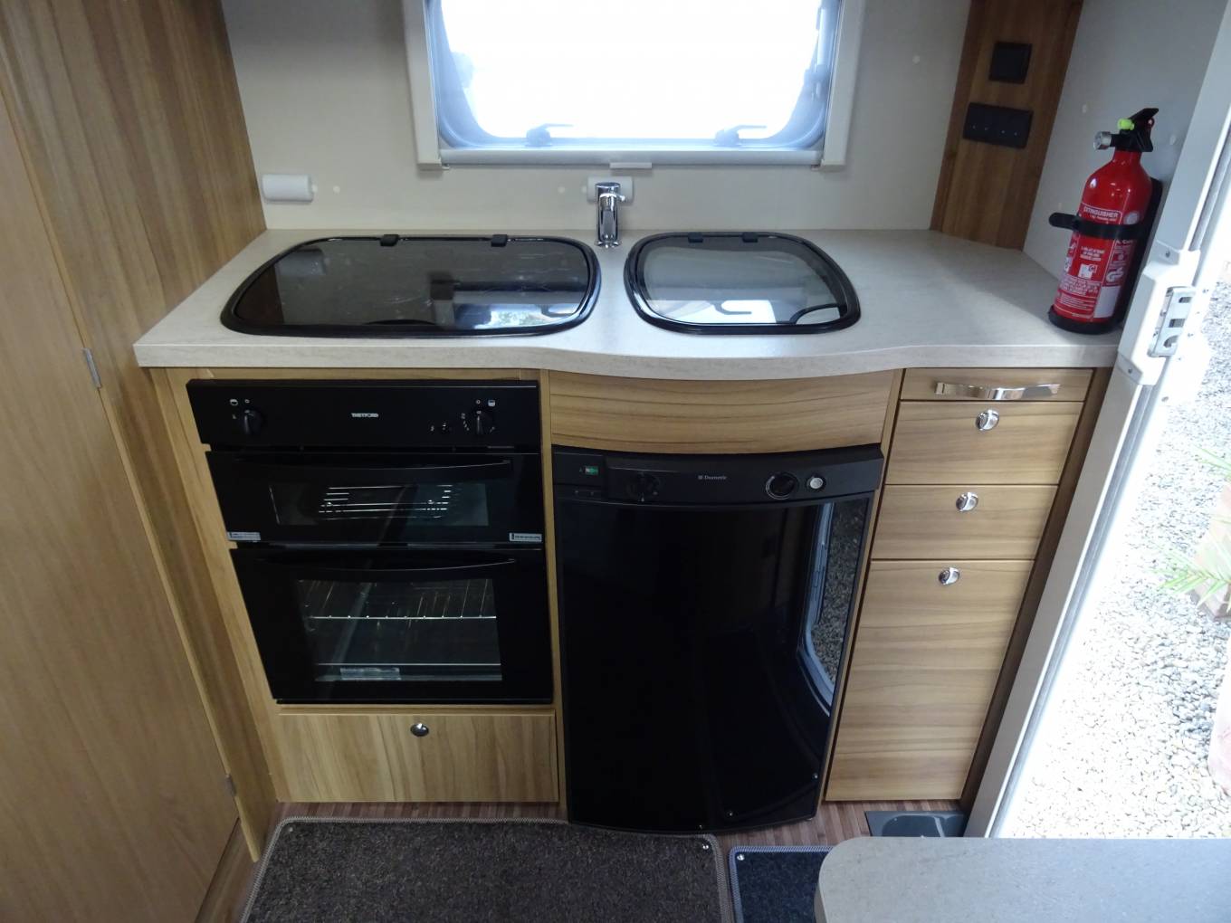 At the rear, we have the kitchen, with its spotless Thetford 3 gas hob, cooker and grill, adjacent to the Dometic 3 way fridge. To the side of this, we have extra pull-out work top, drawers and a low cupboard. Above is the sink with mixer tap and a drainer which stores nicely in the sink. There is a rear window and storage cupboards above. Also at the rear, is the washroom, with bi-fold door separating the shower and toilet, it is immaculate.