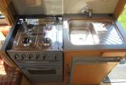 Kitchen - Sink with mixer tap - 4x gas hobs - Country Lesiure Oven and Grill - Dometic three-way fridge with freezer compartment.