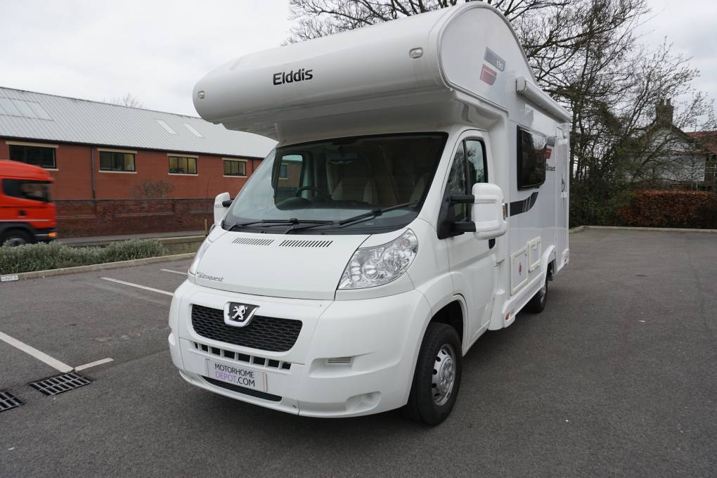 The quintessentially British end-kitchen overcab coachbuilt Elddis Autoquest 130 van can remain compact while still having a roomy lounge and washroom. The mix of overcab and lounge beds means there’s room for five to sleep in comfort.