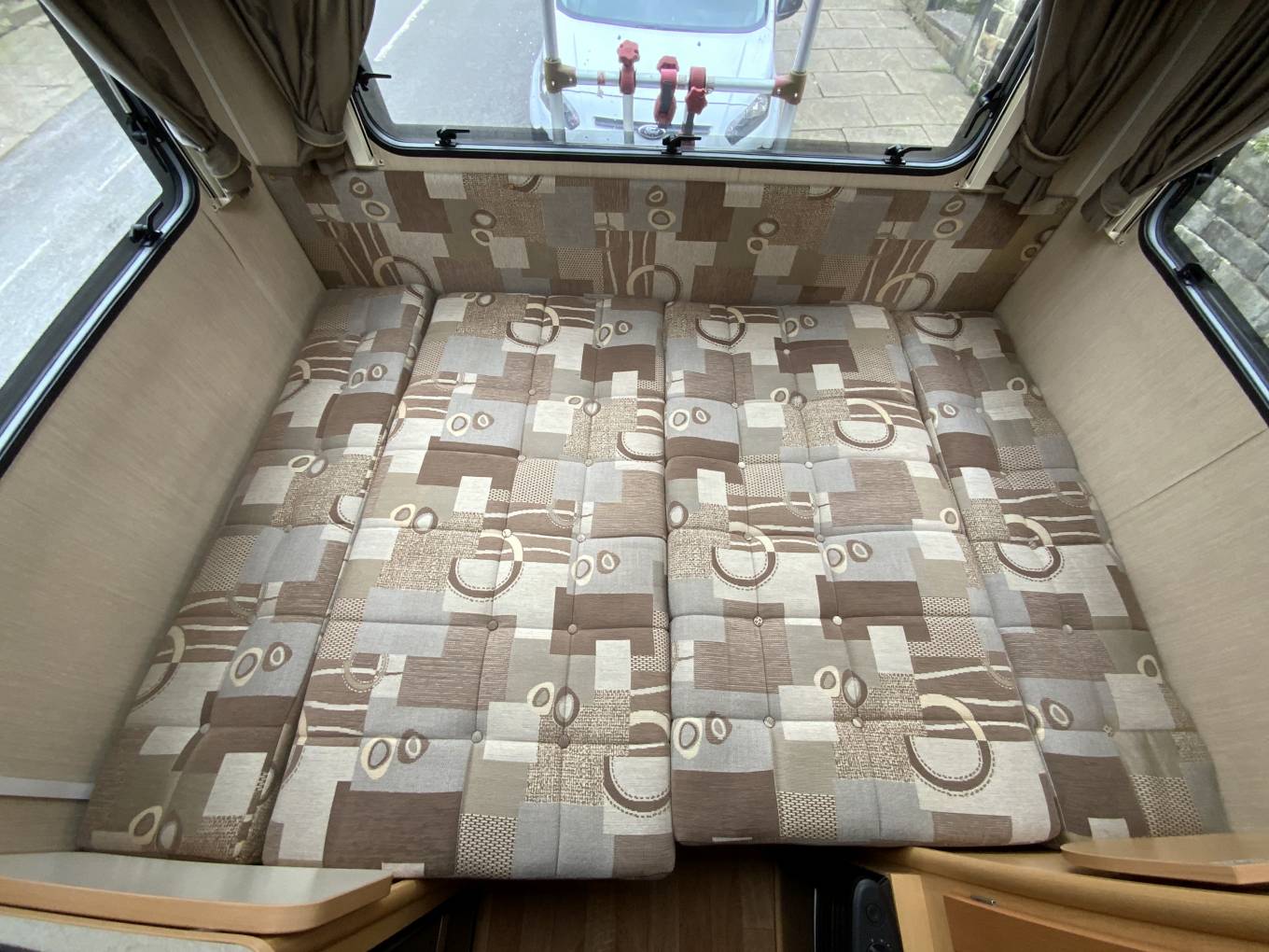 Layout is overcab double bed, rear u-shaped lounge converts to double bed, central kitchen and dinette. Central toilet and washroom areas.