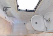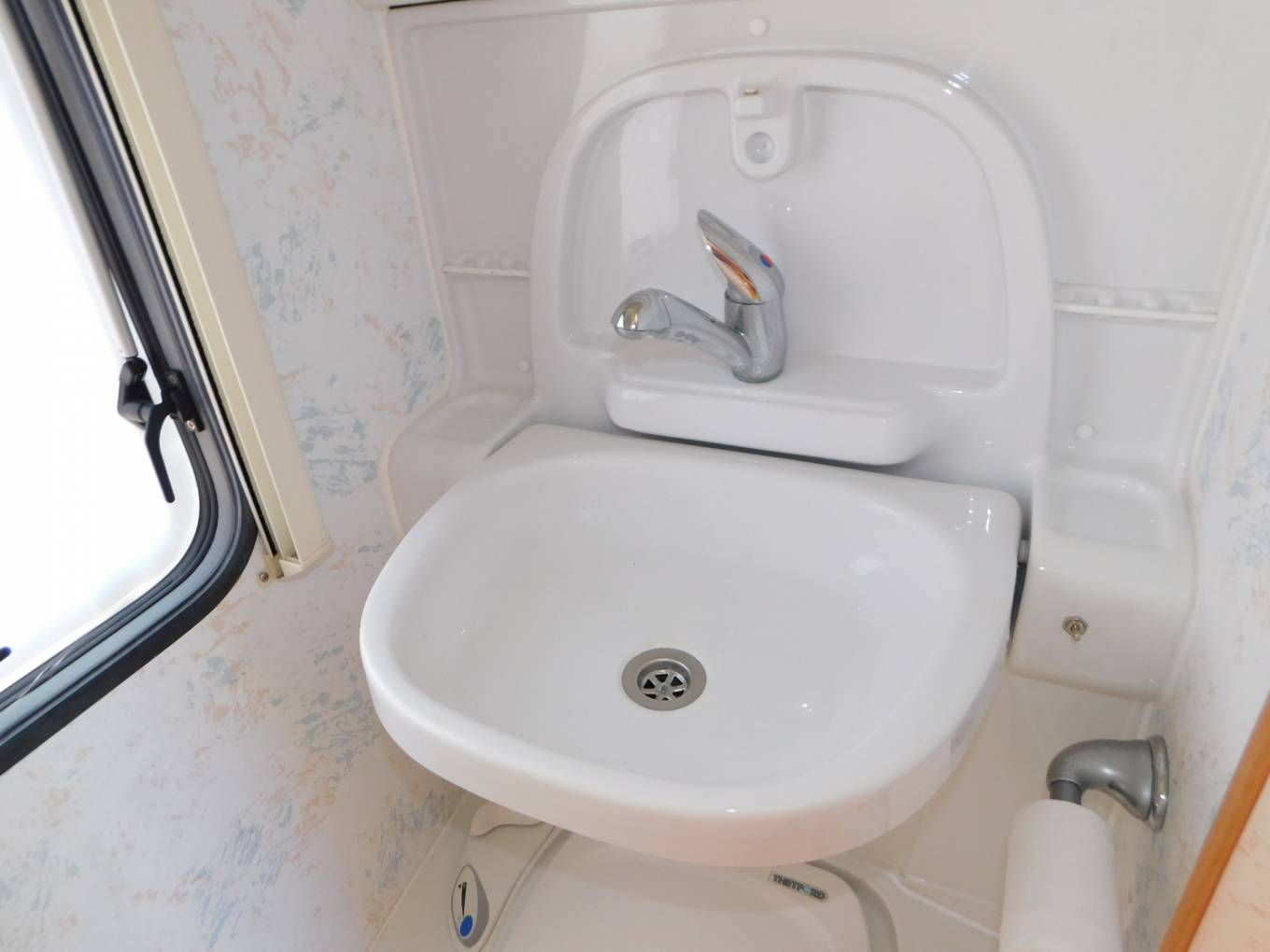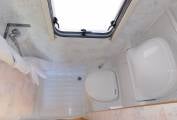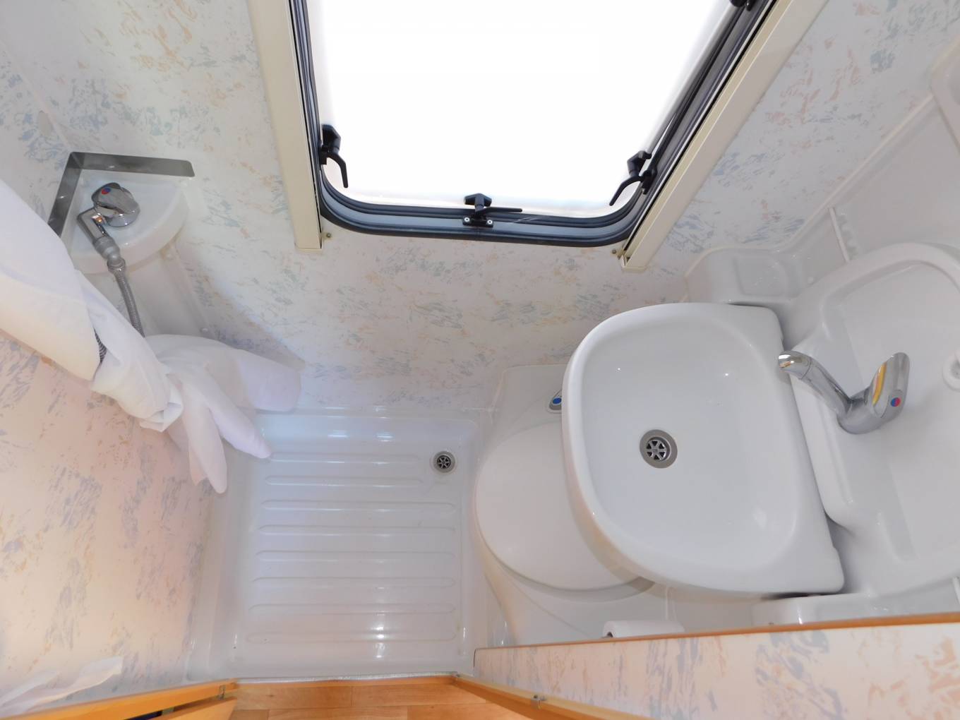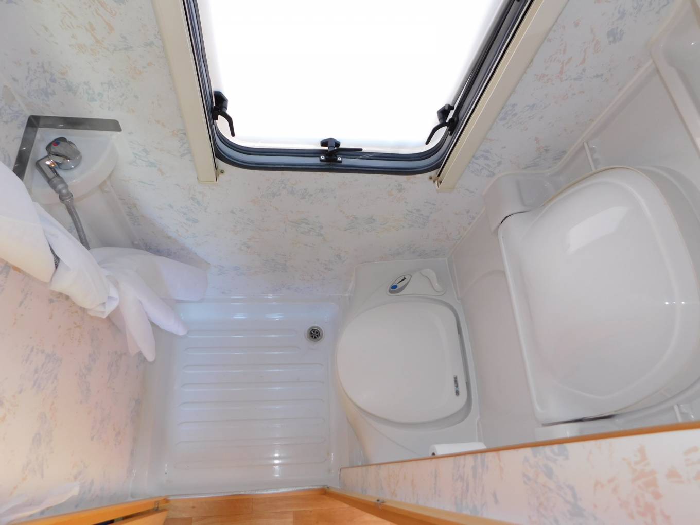 The washroom has a shower tray, shower curtain and handset fitted to a rising rail, a Thetford cassette toilet with electric flush, a drop down wash-basin with chrome mixer tap and a mirrored cabinet.