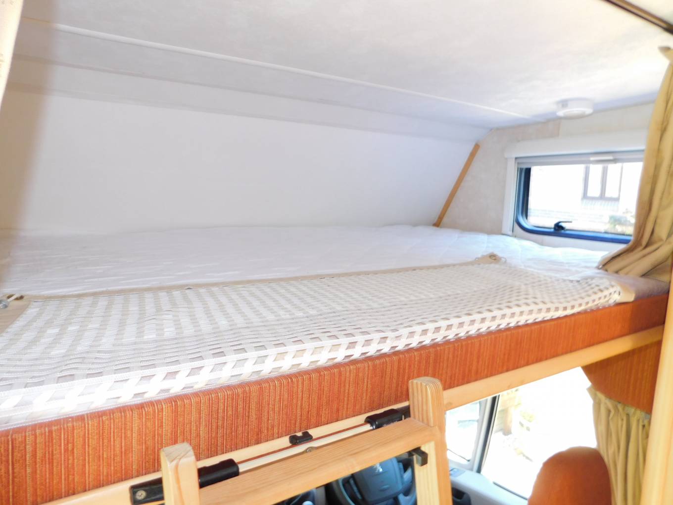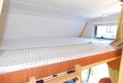 The over-cab bed pulls down on gas struts, it has a window for natural daylight, privacy curtains, a safety net and a wooden ladder to access the bed.