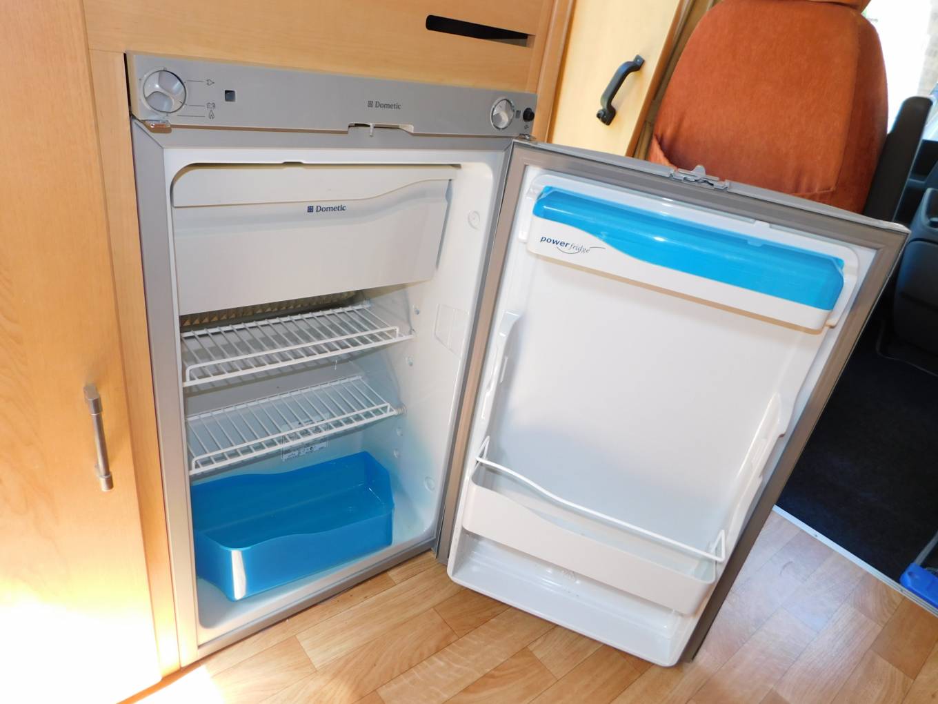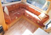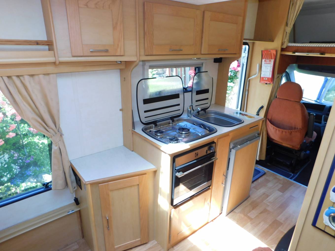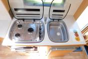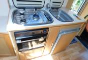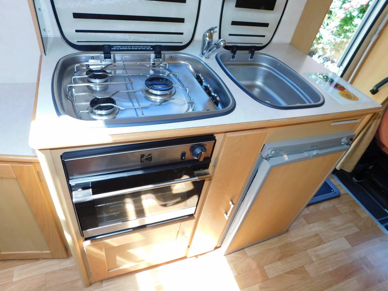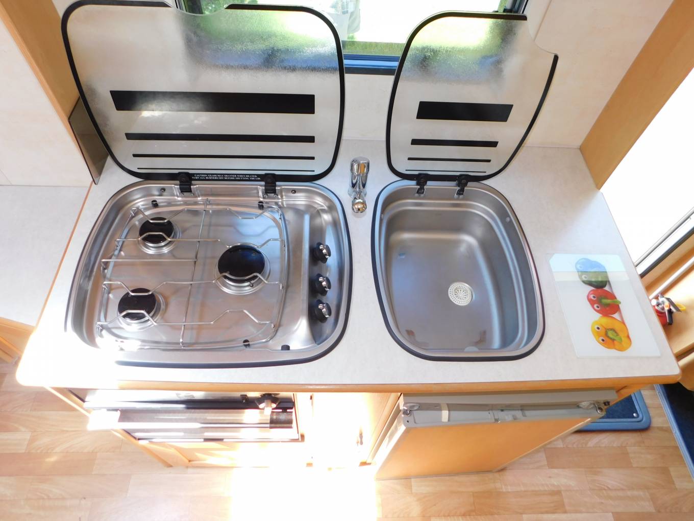 Step inside and you have the kitchen on your right, with a large sink with chrome mixer tap and glass lid, a 3 gas burner hob with glass lid, an oven and grill fitted beneath, a three-way powered Dometic fridge with ice-box and plenty of cabinets to store away your holiday provisions.