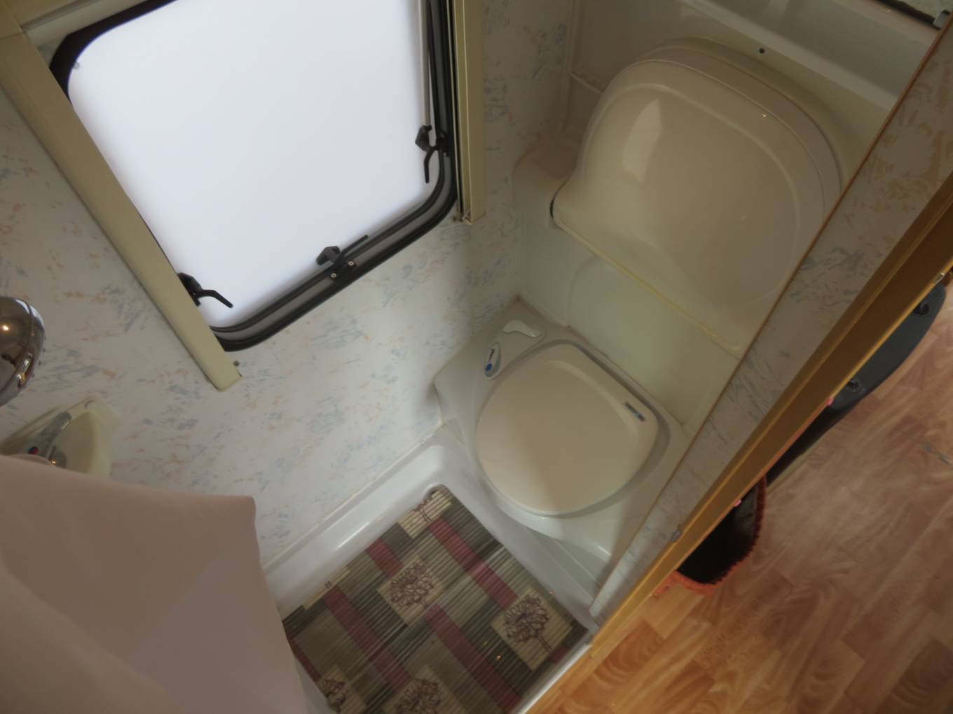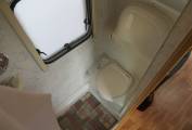 The washroom has a shower tray, shower curtain and handset fitted to a rising rail, a Thetford cassette toilet with electric flush, a drop down wash-basin with chrome mixer tap and a mirrored cabinet.