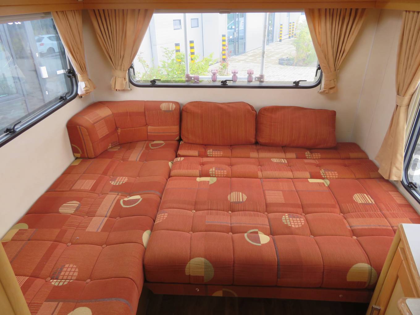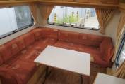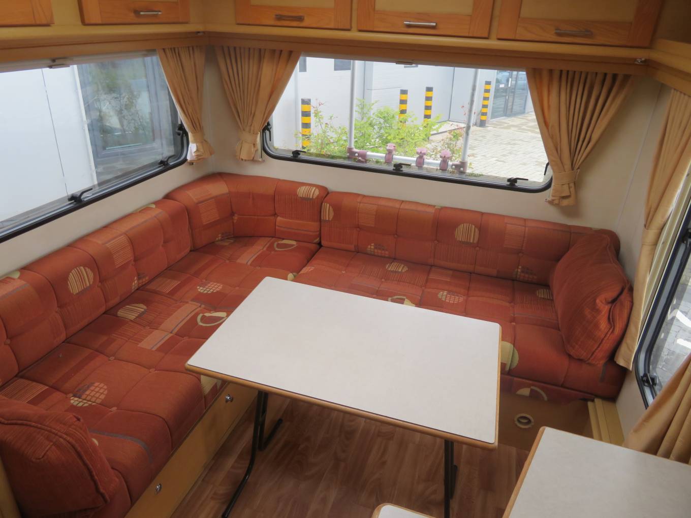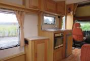 Step inside and you have the kitchen on your right, with a large sink with chrome mixer tap and glass lid, a 3 gas burner hob with glass lid, an oven and grill fitted beneath, a three-way powered fridge with ice-box and plenty of cabinets to store away your holiday provisions.