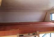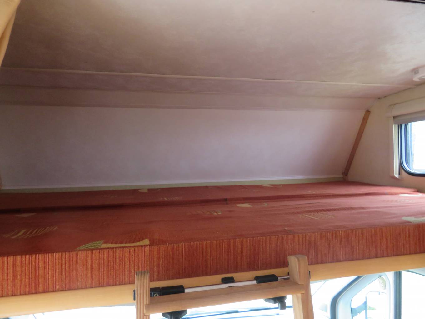 The over-cab bed pulls down on gas struts, it has a window for natural daylight, privacy curtains, a safety net and a wooden ladder to access the bed.