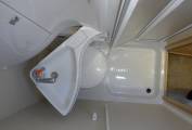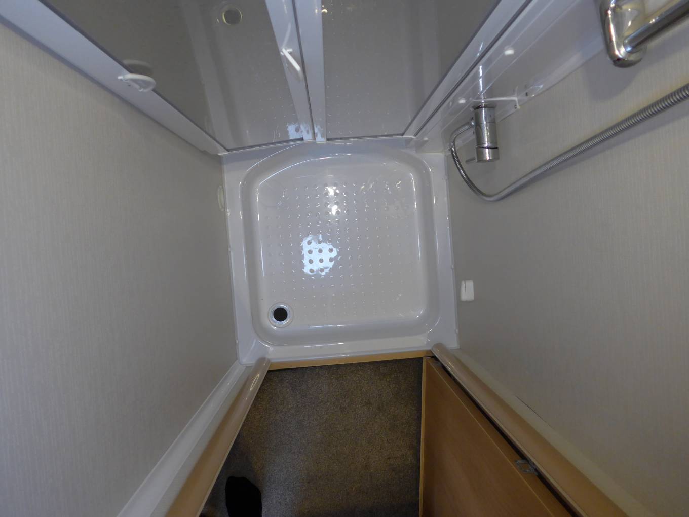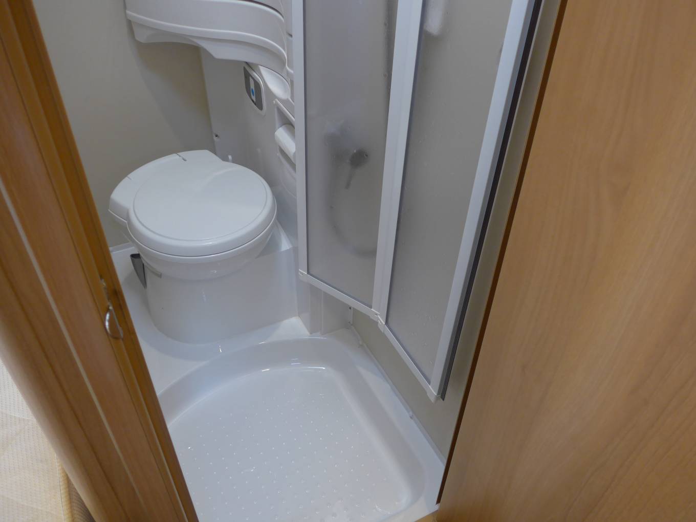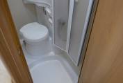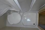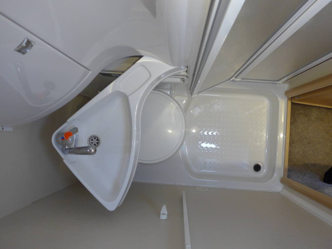 Corner Washroom with Thetford Cassette Toilet, Washbasin which folds away for more room and separate shower area.