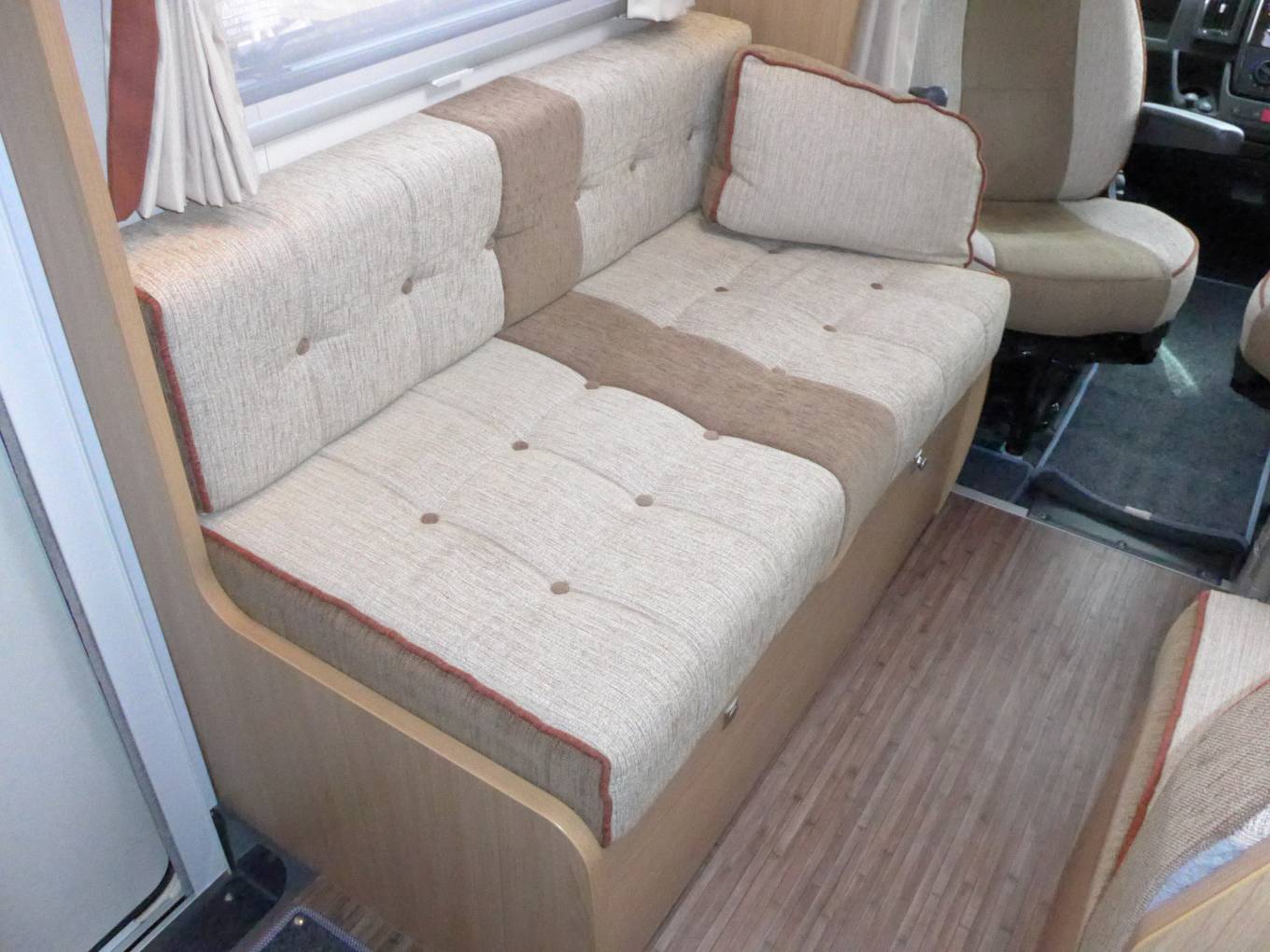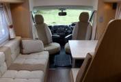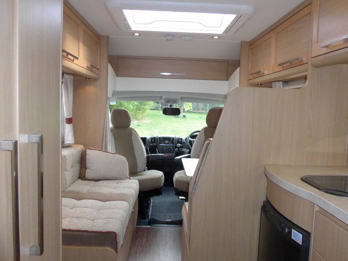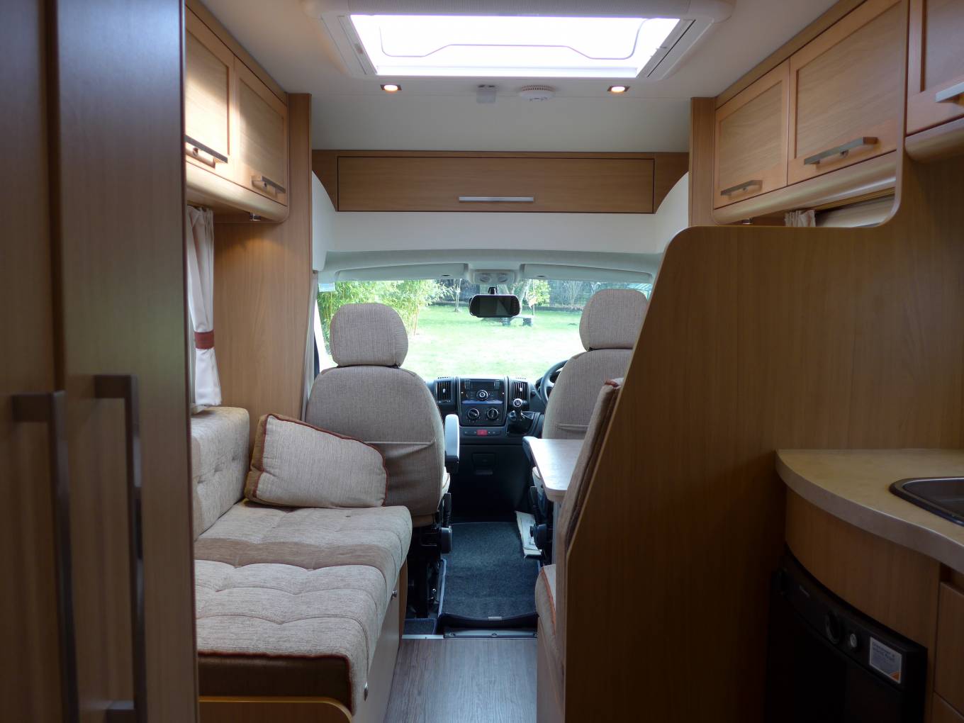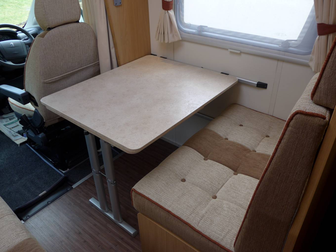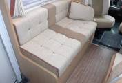 Layout comprises a Cab area with two swivel captains chairs, Centre Dinette with two more Travelling seat belts, side Sofa with Storage underneath. Dining for up to 6 adults with an and adjustable dining table. This area converts to a double bed.