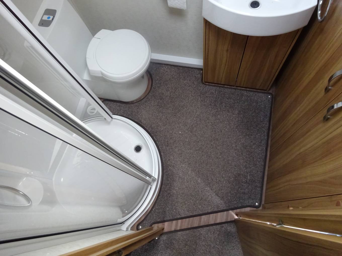 At the rear of the Motorhome there's a large bathroom featuring WC, Sink, Separate shower, Vanity unit and Large Wardrobe.
