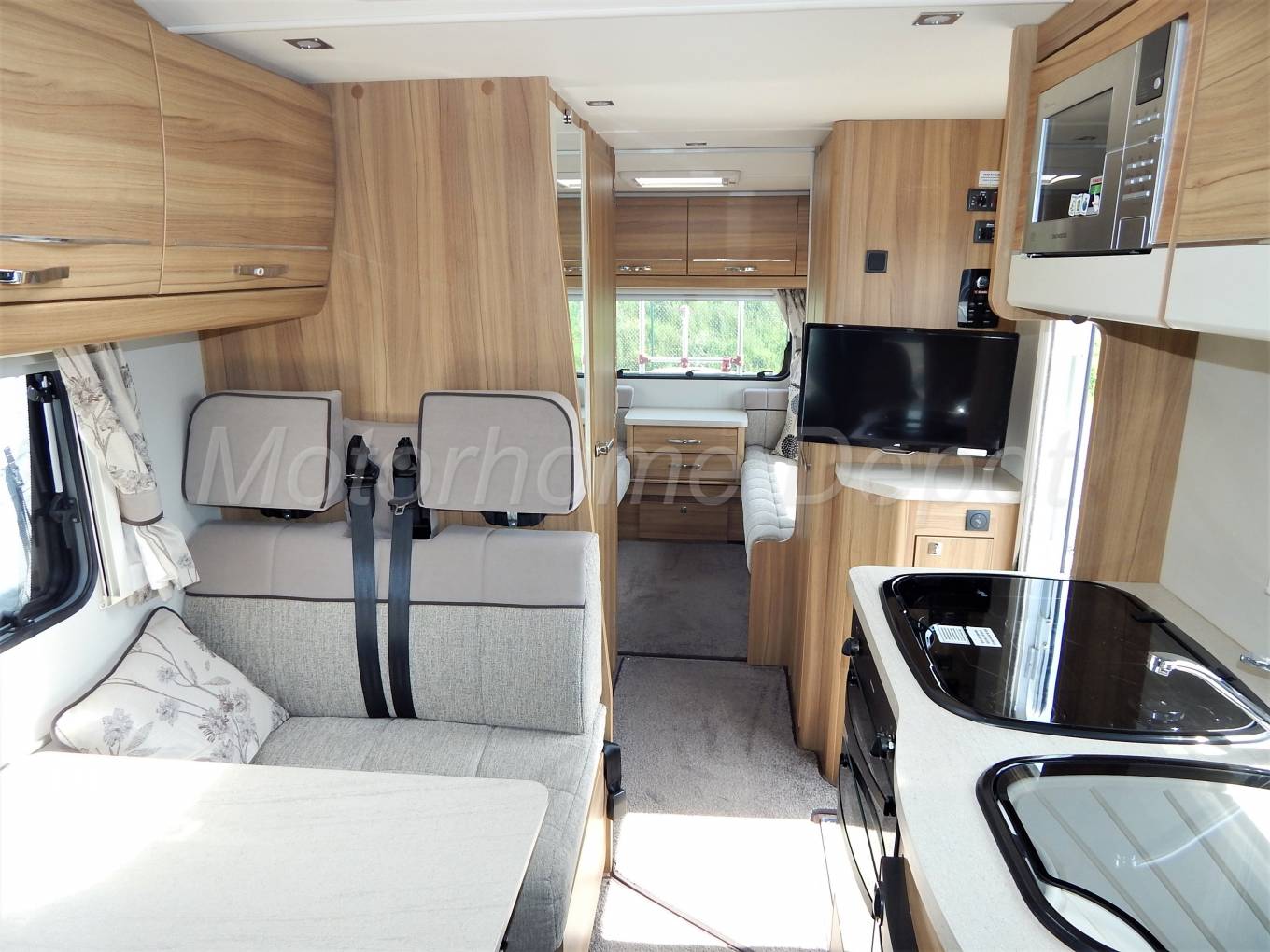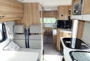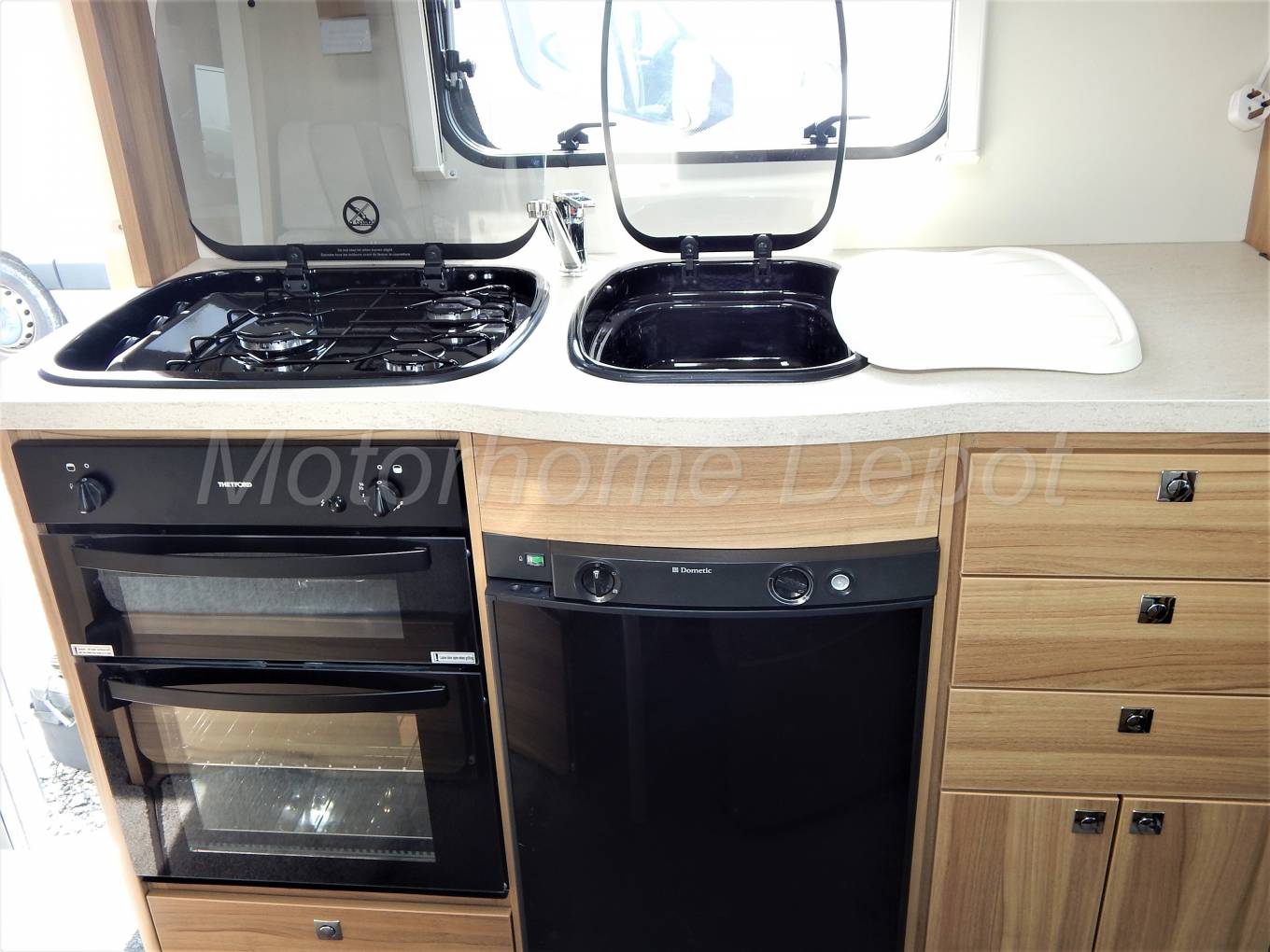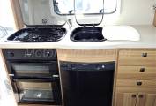Opposite is the Kitchen area which comprises of a work surface incorporating a black enamel style sink and chrome mixer tap. The fridge freezer is under the counter and is a 3 way absorber unit that can be powered by; 240v,12v or gas depending whether you are plugged in on site or wild camping. There is a full oven and grill with a dual fuel hob comprising of a 240v hot plate and 3 gas burners. overhead there is plenty of locker space and a Daewoo microwave.