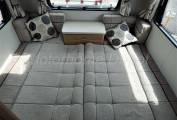 To the rear is the huge rear lounge which is made up of a U shaped sofa arrangement with an additional TV Point with large flat screen TV. The table stows away when travelling in the wardrobe and there is ample storage above and below. This area makes up a Large double by pulling slats from the rear and using the cushions to make up the mattress, it can also be used as Twin singles.