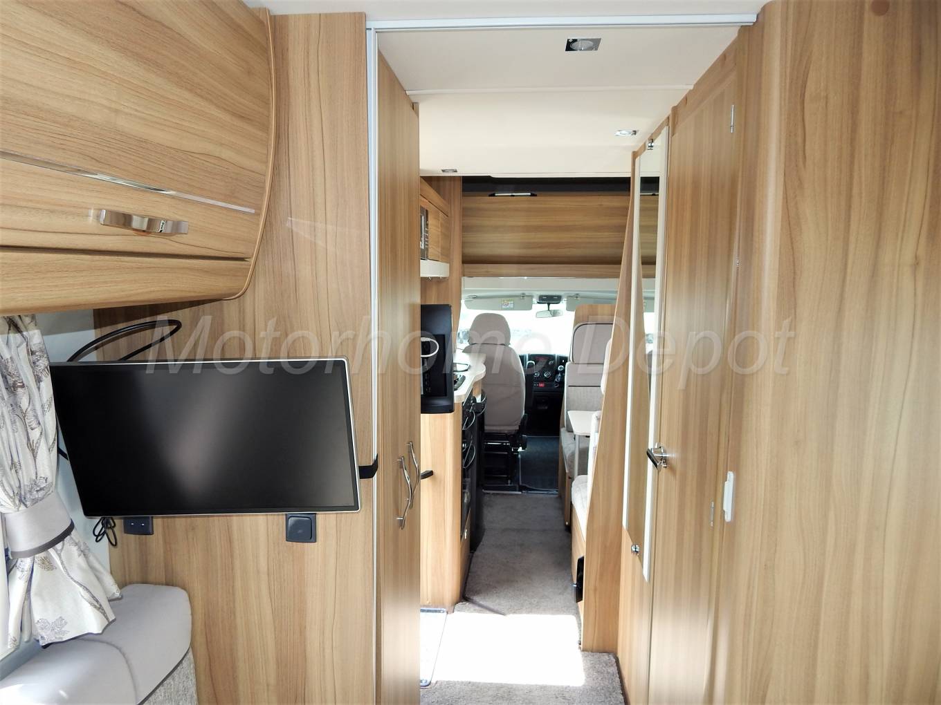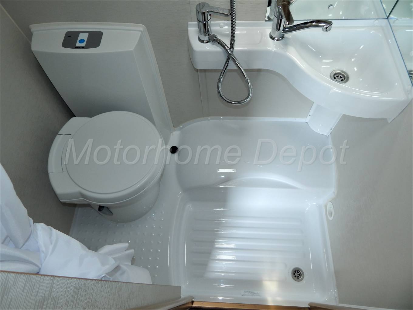 Moving Rear there is a TV point with a large flat screen JVC TV for the front cabin, a large hanging wardrobe and opposite a combined bathroom & shower which has a Thetford fresh water flush swivel head toilet, built in wash hand basin with chrome mixer tap. The shower has a curtain to keep the toilette dry whilst in use.