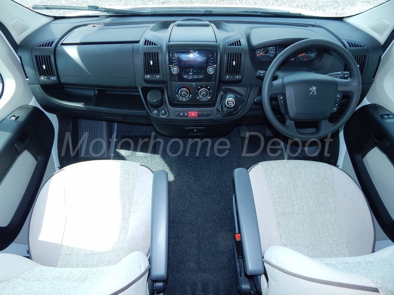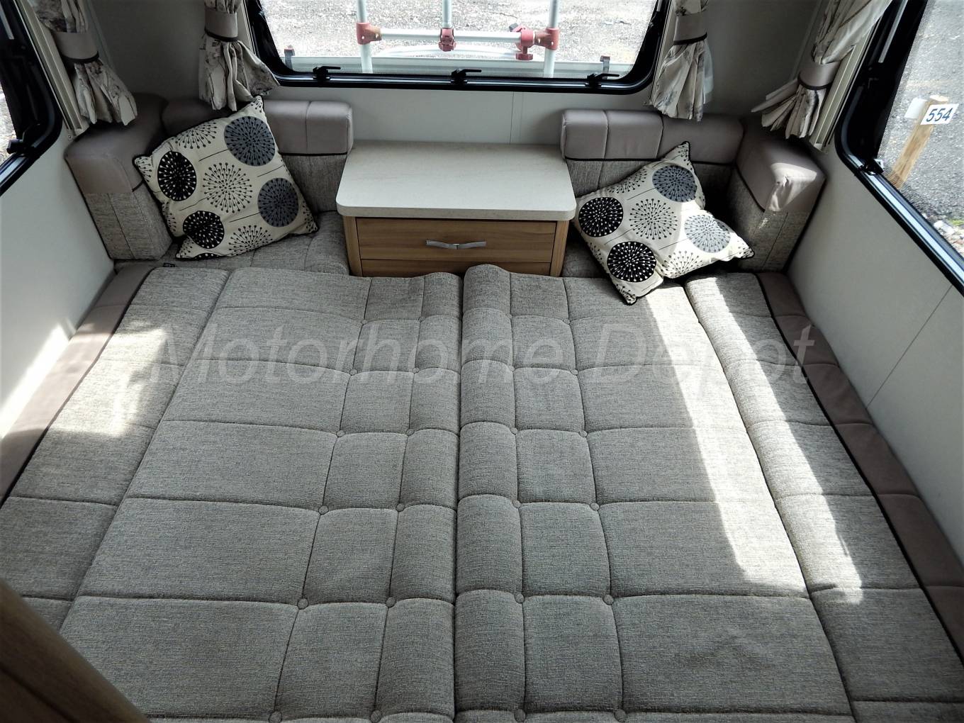 This Stunning Elddis Autoquest 180 really is a fantastic family motorhome having 6 berths and 6 travelling seats. Based on a Peugeot Boxer 2.2 TDI with a 6 speed manual gearbox, first registered on 04/08/2015 and having had 2 owners from new and covered 7040 miles. Supplied serviced & Habitation checked most recently by Stewart Mouland in 11/18, next due in 11/19. The Cab benefits from Electric front windows and central locking the front and side windows have remis blinds. The head unit is a factory fit DAB Radio unit that also incorporates Bluetooth connectivity for your phones USB & AUX in. Overhead there is a drop down section in the roof that makes up in to a large double bed when not travelling which is accessed by a removable ladder.