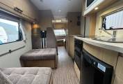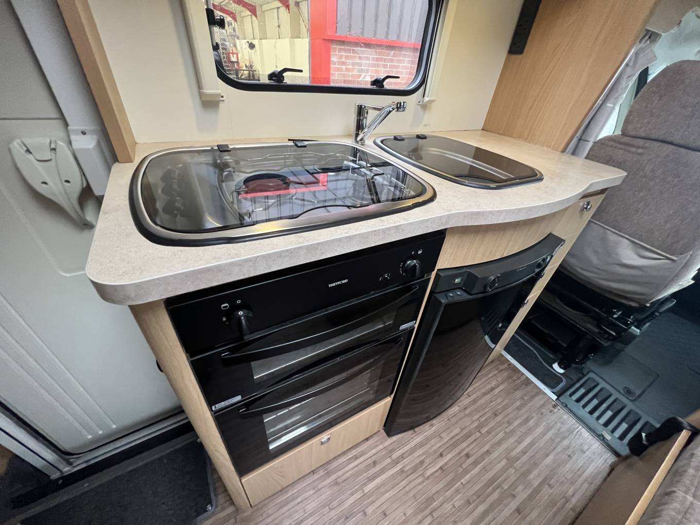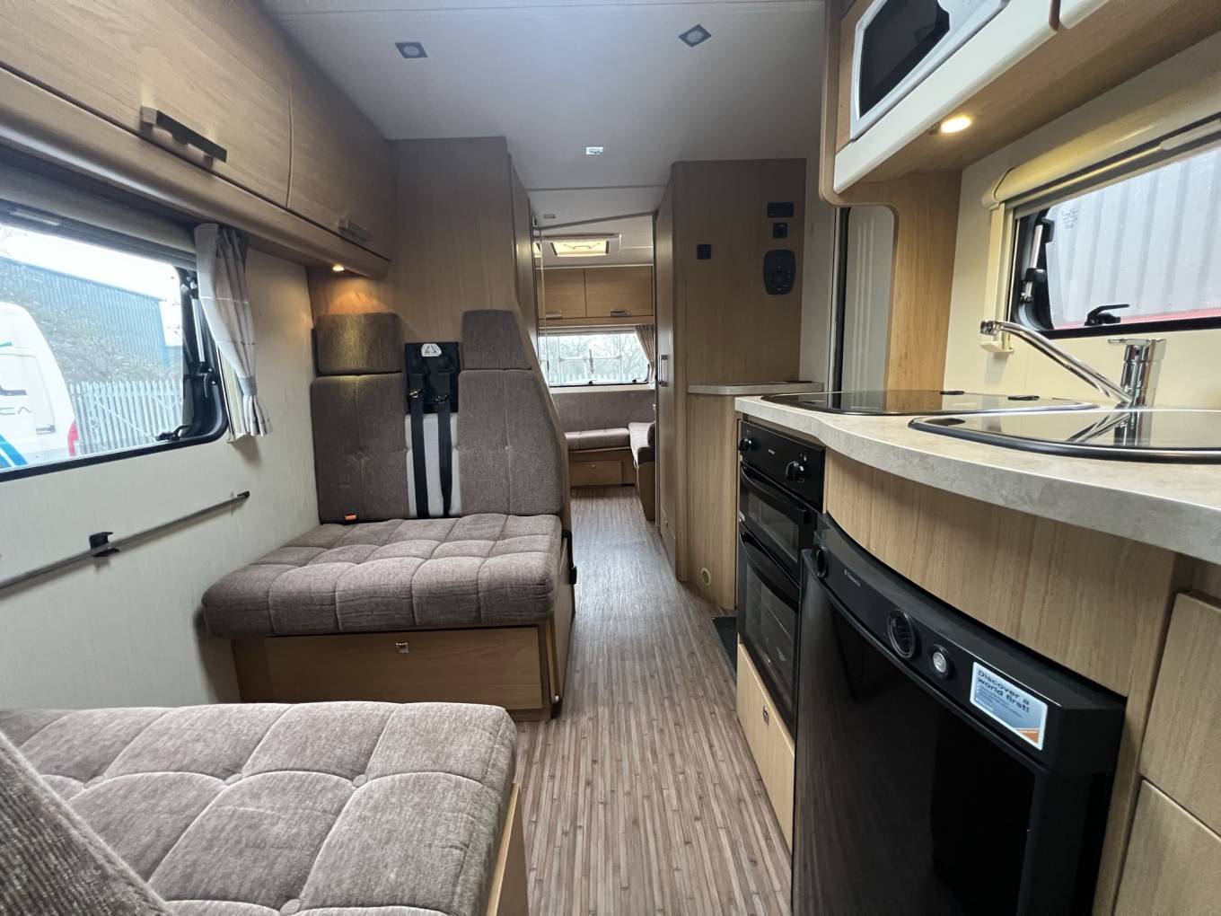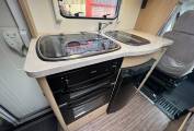 Next to the double dinette is the kitchen area with a full cooker and grill with 3 burner hob and sink with mixer tap for hot and cold water. Next to the cooker is the full size fridge with freezer compartment. Above the cooker is the microwave within its own cupboard.
