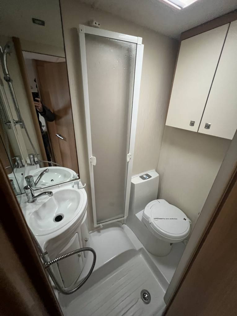 Making you way to the rear of the motorhome the large washroom with toilet, sink and shower can be found beside a large wardrobe.