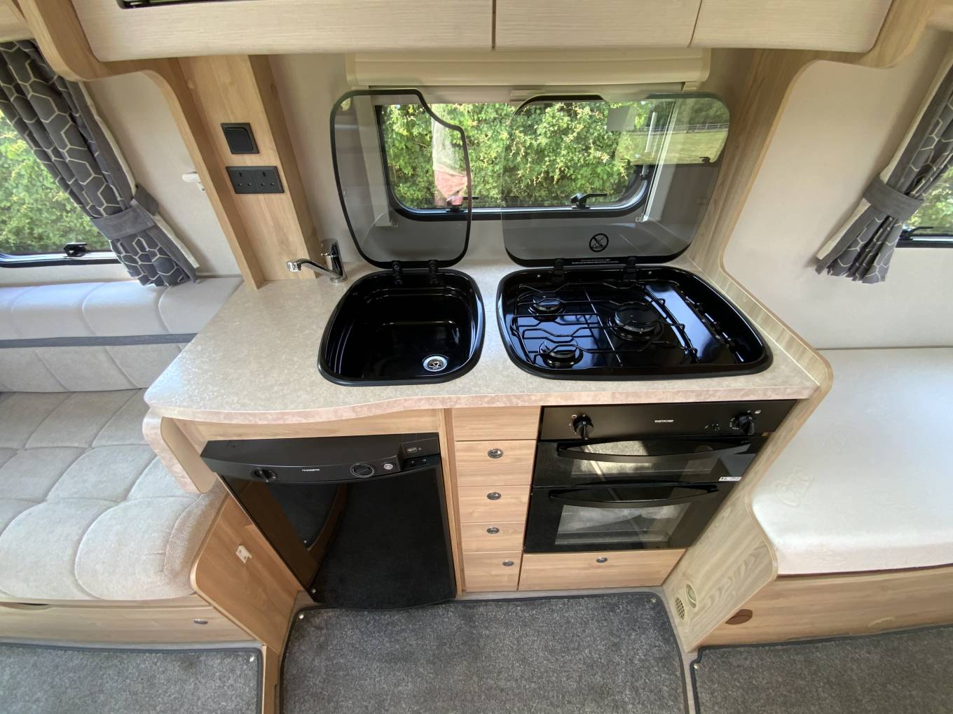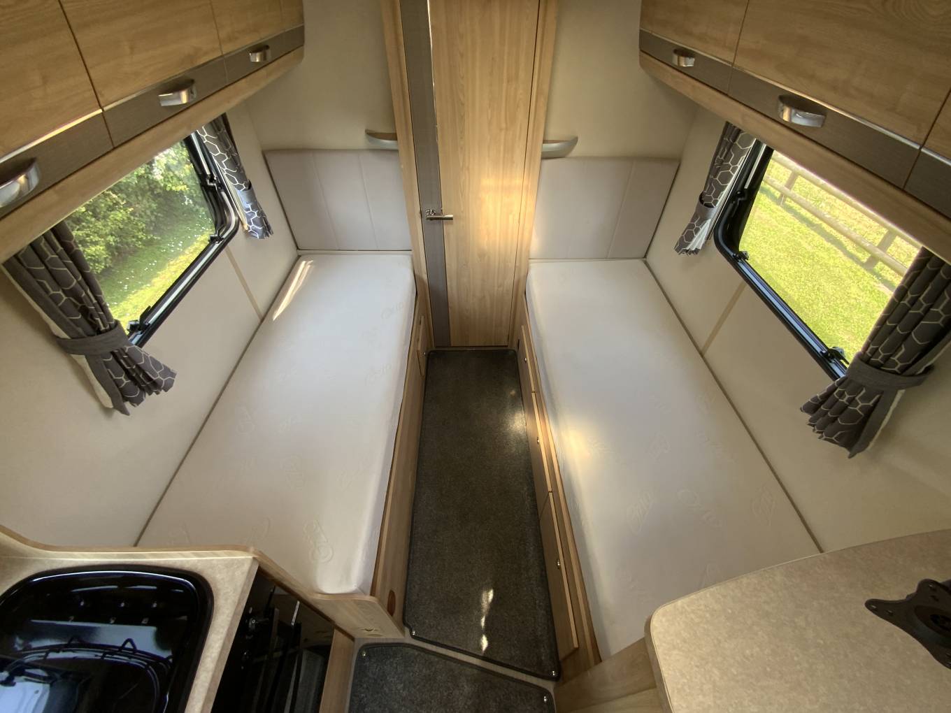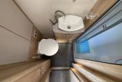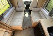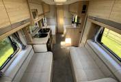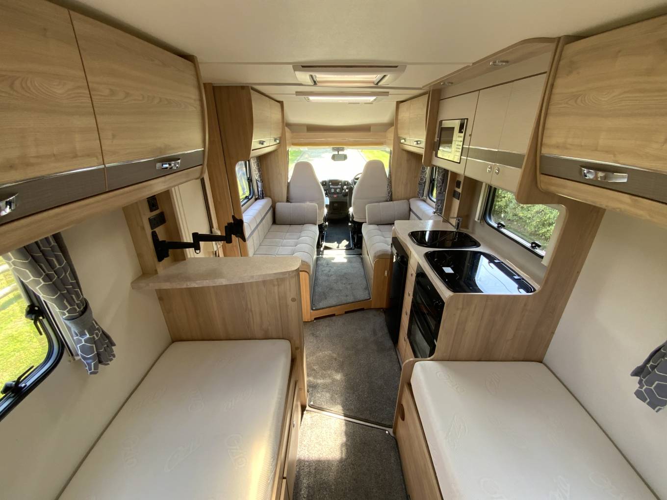 It features a spacious end washroom consisting of a toilet, hand wash basin, separate shower cubicle and ample storage. Next up working forward is two comfortable single beds with storage underneath. As we move through this spacious and well laid out motorhome we come to the well equipped kitchen which includes a 3 ring gas burner, grill, oven, microwave, wash basin and 3 way fridge freezer. Next is the lounge area which consists of 2 comfortable benches that convert into a double bed and also hide two clever fold away travel seats, the 2 cab seats also swivel and there is a table. This motorhome comes with lots of extras such as a wind out canopy, reversing camera, cab air con and refillable gas.