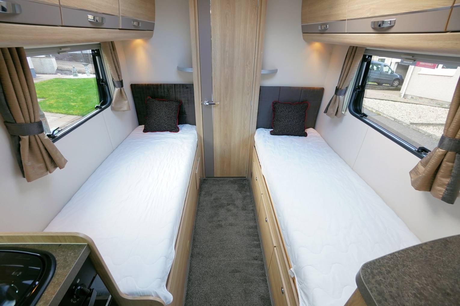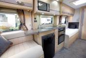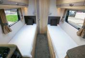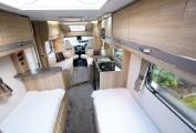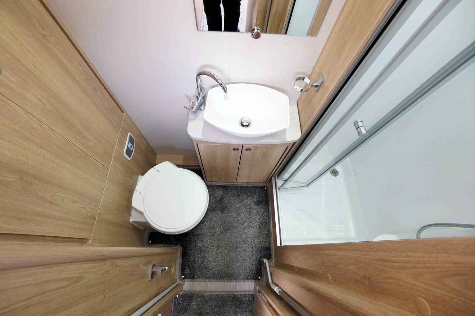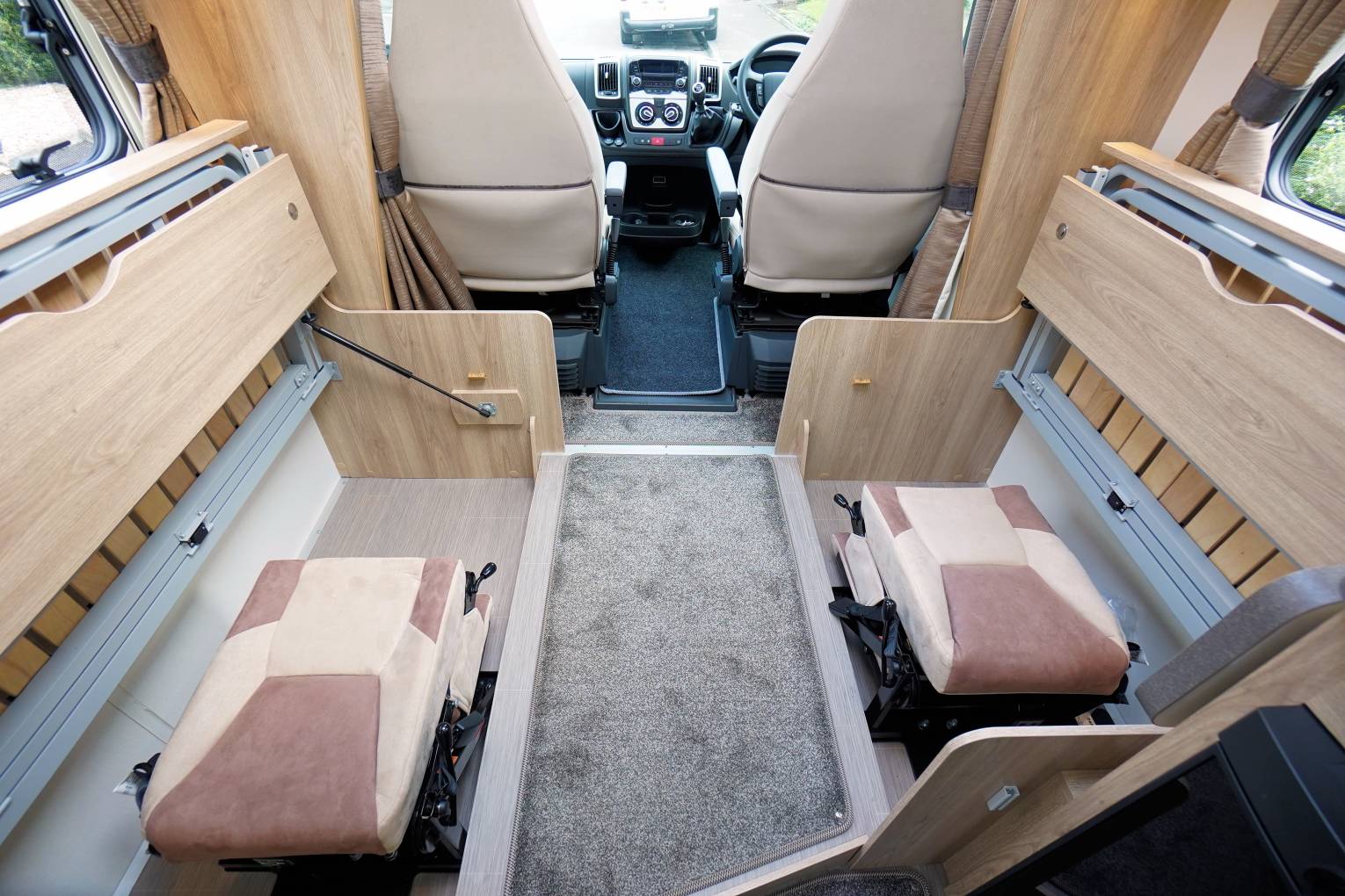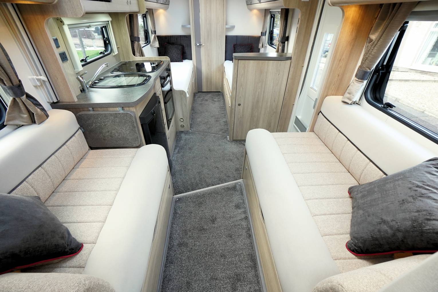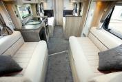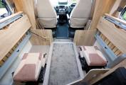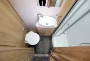Entering the vehicle, it immediately feels bright and airy with lots of natural light. Towards the front is the lounge / dining area with two sofas and the two front seats swivel into the area allowing six people to dine in comfort using the fold-away dining table. The front sofas make a double bed that can be kept private using the fold-away partition blind. Below the sofa seats are the two extra, forward-facing, fold-away travel seats with 3-point seat belts. The centre kitchen area provides ample work surface with an extendable top, oven, grill, hob with 3 x gas rings and 1 x electric ring, microwave oven, 3-way fridge with freezer compartment and a sink with hot and cold water. The water and vehicle are both heated via the Whale system that runs off gas and/or electric and there are removable carpets throughout keeping this motorhome cosy for year-round use. Next to the kitchen area are the two fixed single beds and then at the rear is the washroom with Thetford cassette toilet, vanity unit, large cupboard, basin with mixer tap and separate shower compartment.
