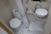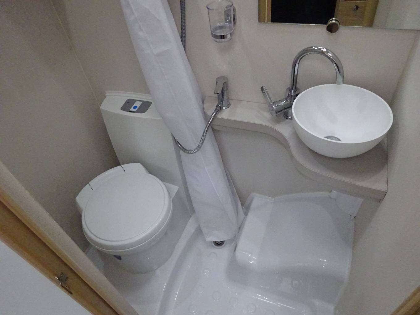 Superb washroom with cassette toilet, sink top basin and shower with curtain.