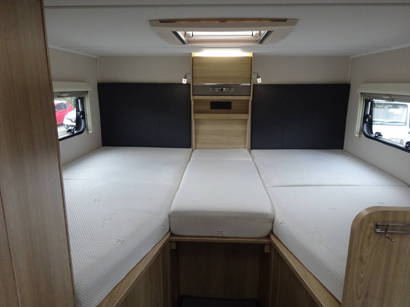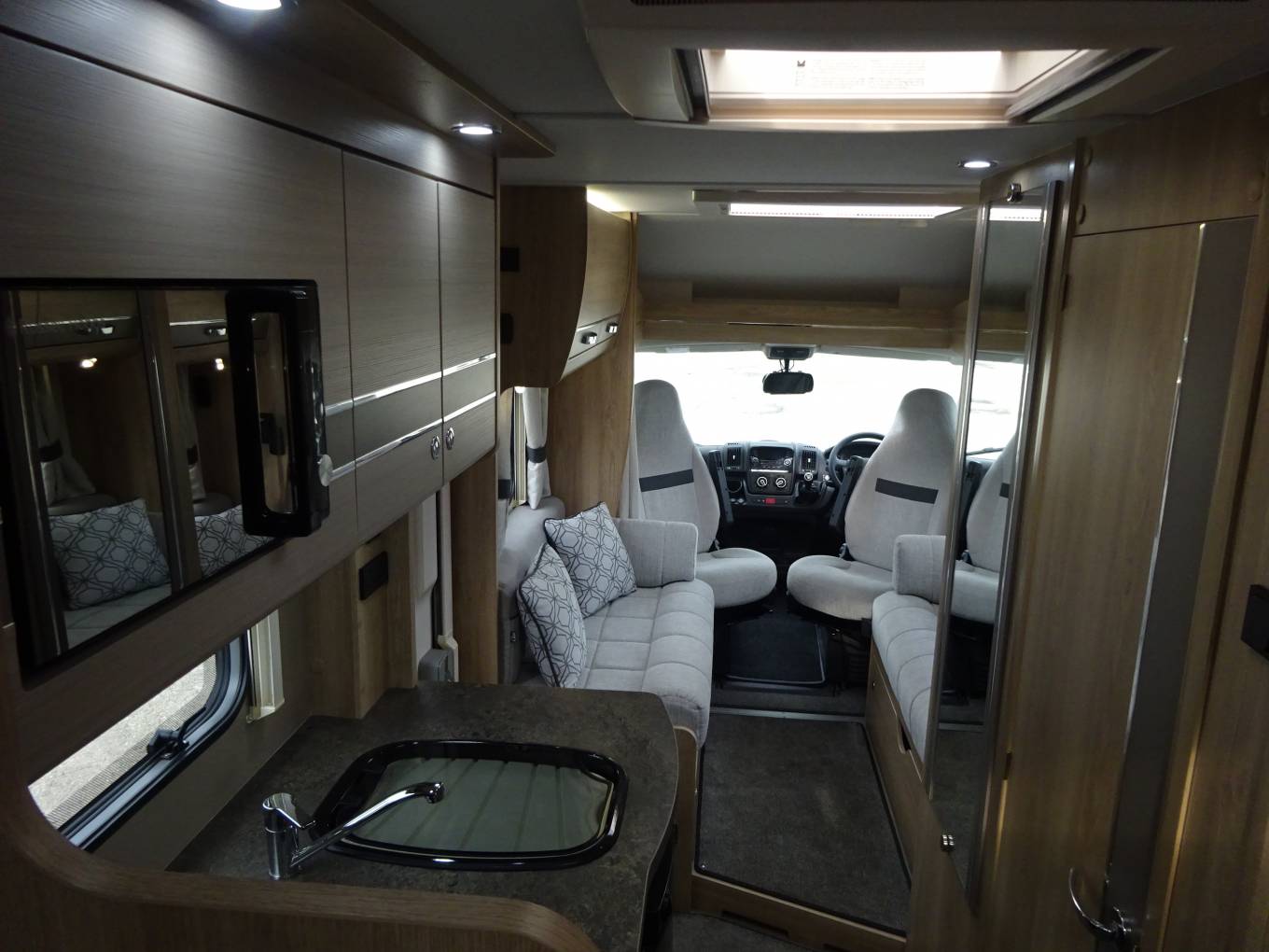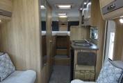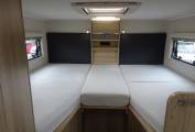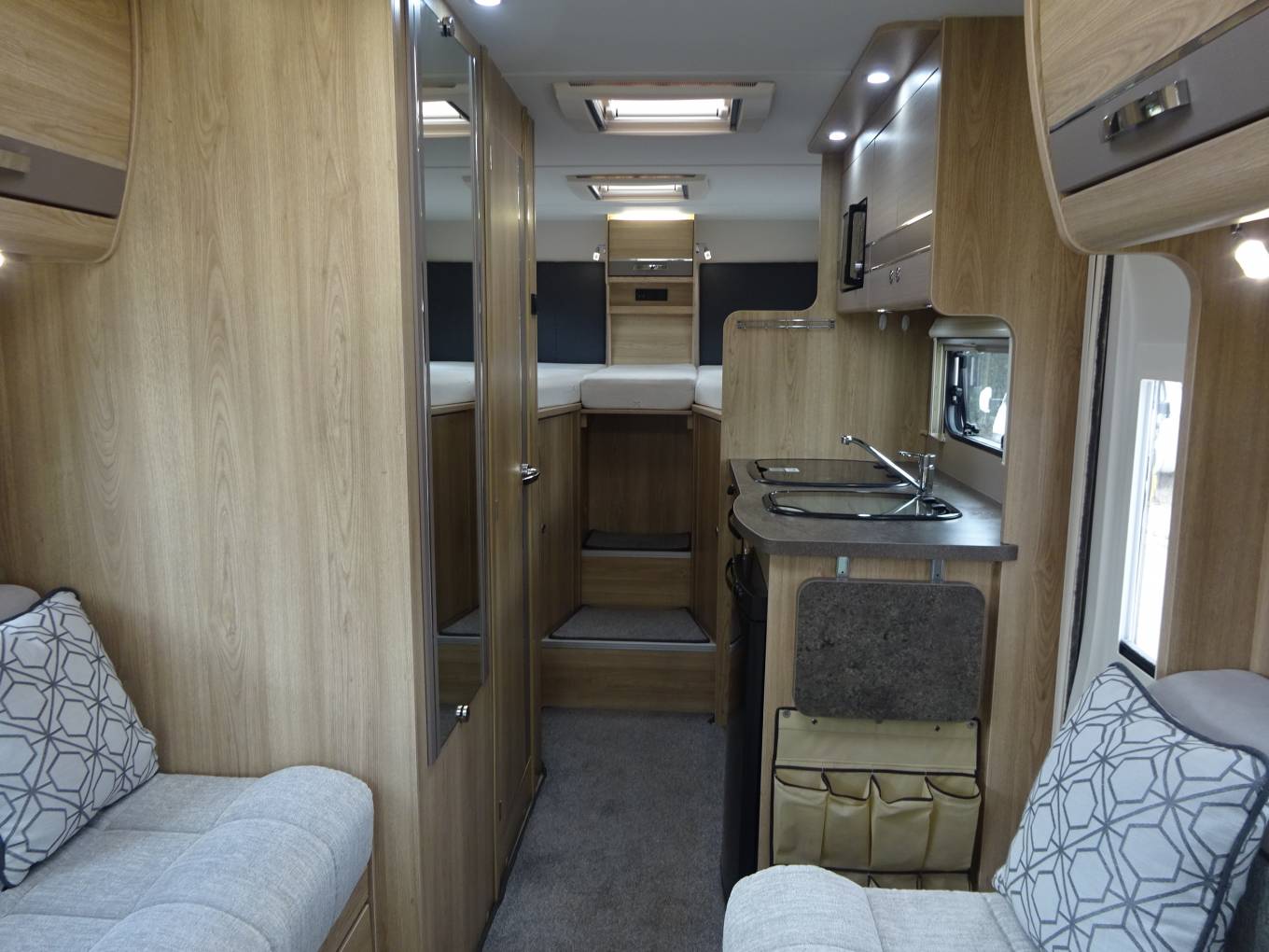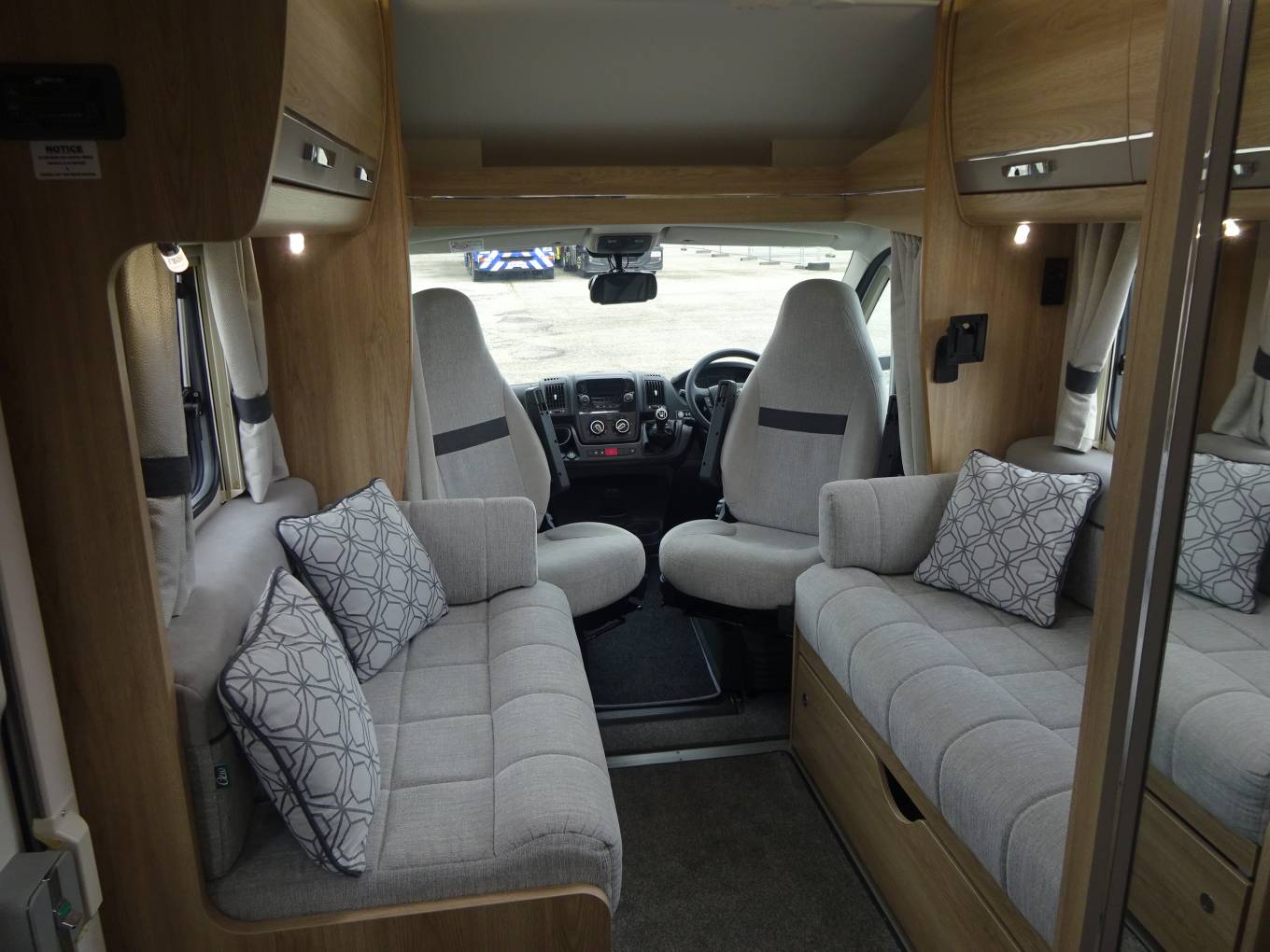The rear of the 194 has a raised sleeping area, which can be used as two single beds, or using the infill sections supplied, a luxury double. Beneath this is a sizeable garage, with exterior access. At the front, the parallel lounge seats four, with foldaway travel seats and converts to a further double bed. A great alternative for two or four travellers.