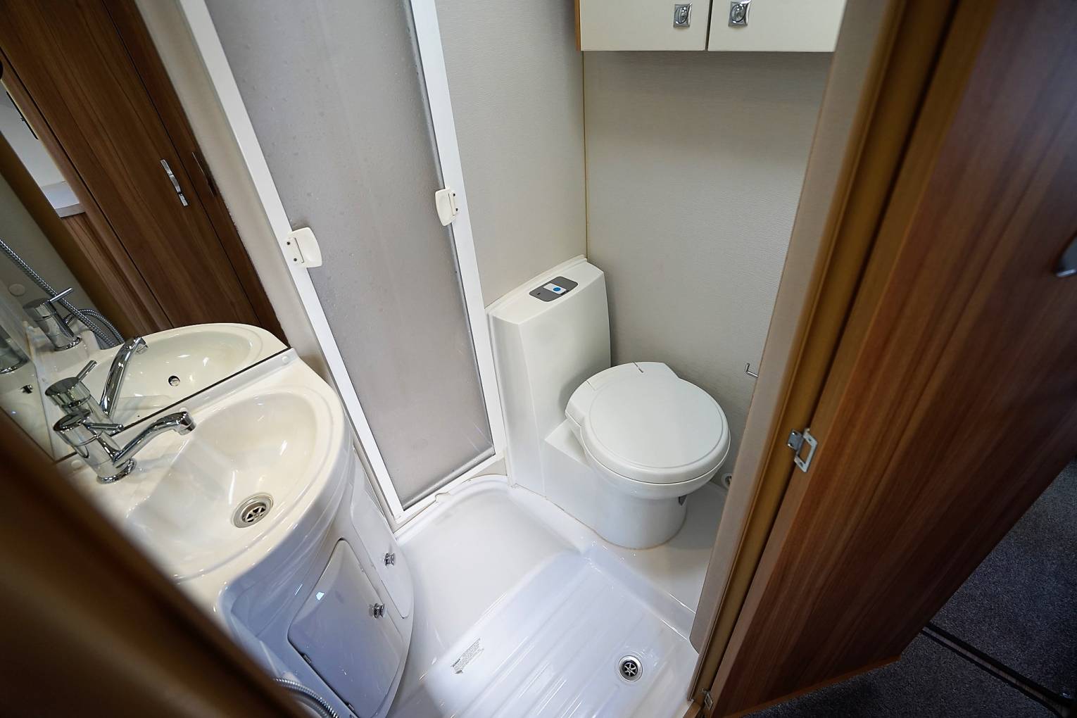 and airy washroom offering a screened shower, sink and cassette lavatory.
