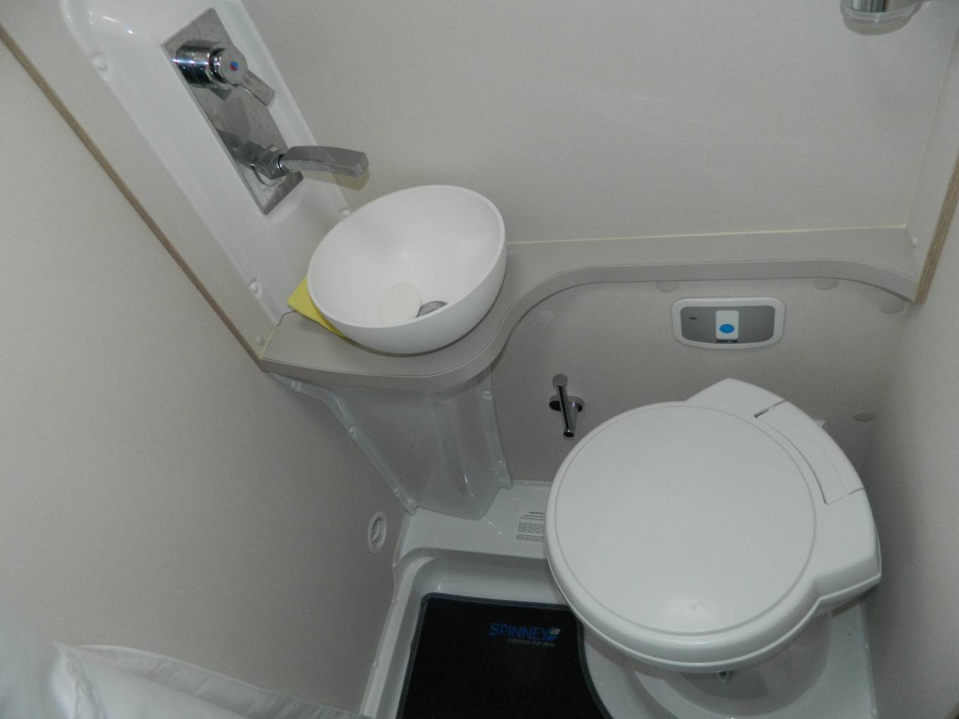 a W/C, wash basin and a wall mounted, retractable tap that doubles up as a