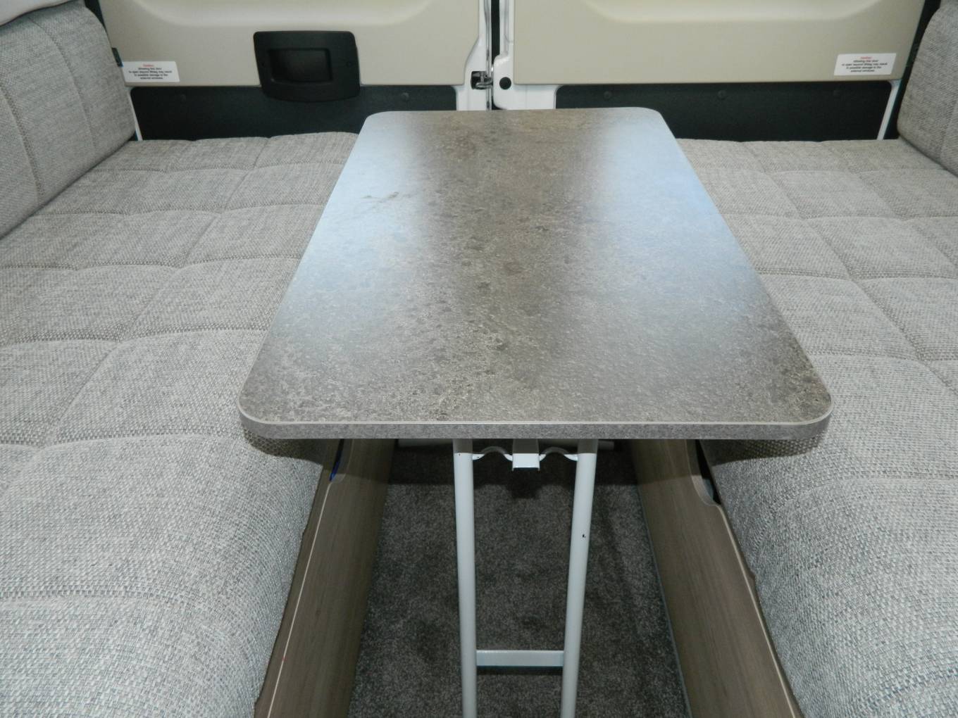 face a forward-facing twin bench seat with an extending table in-between. This area