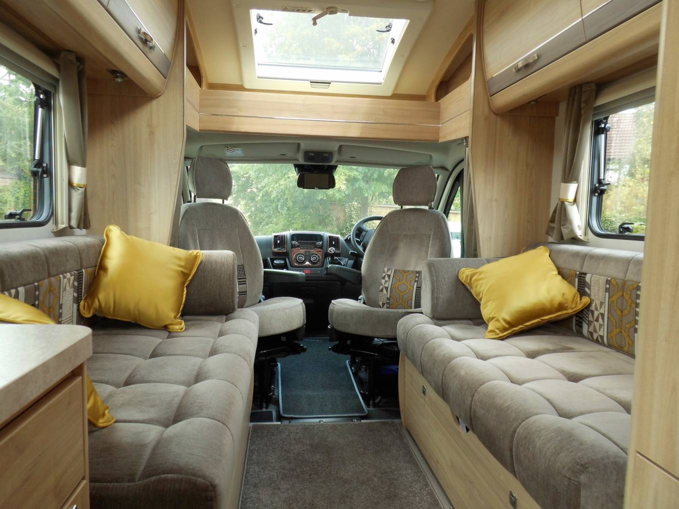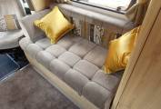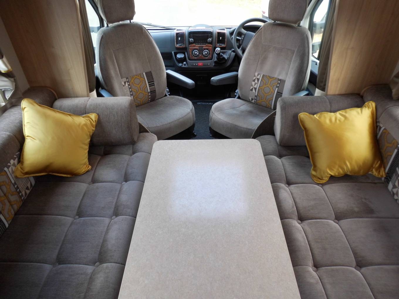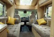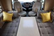 Swivel the cab seats and you’re face-to-face with a lovely lounge area, with the two long bench sofa offering additional comfort to stretch out and really relax. Dining for up to six is easily achieved as a free-standing table sets up between the sofas.
