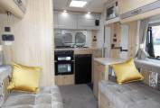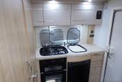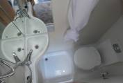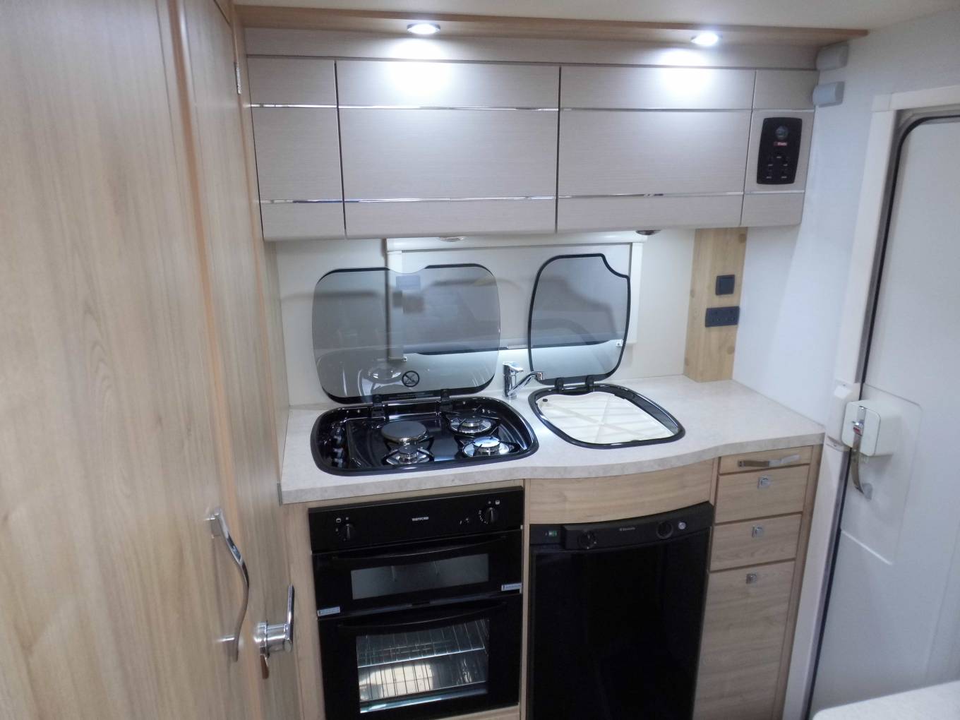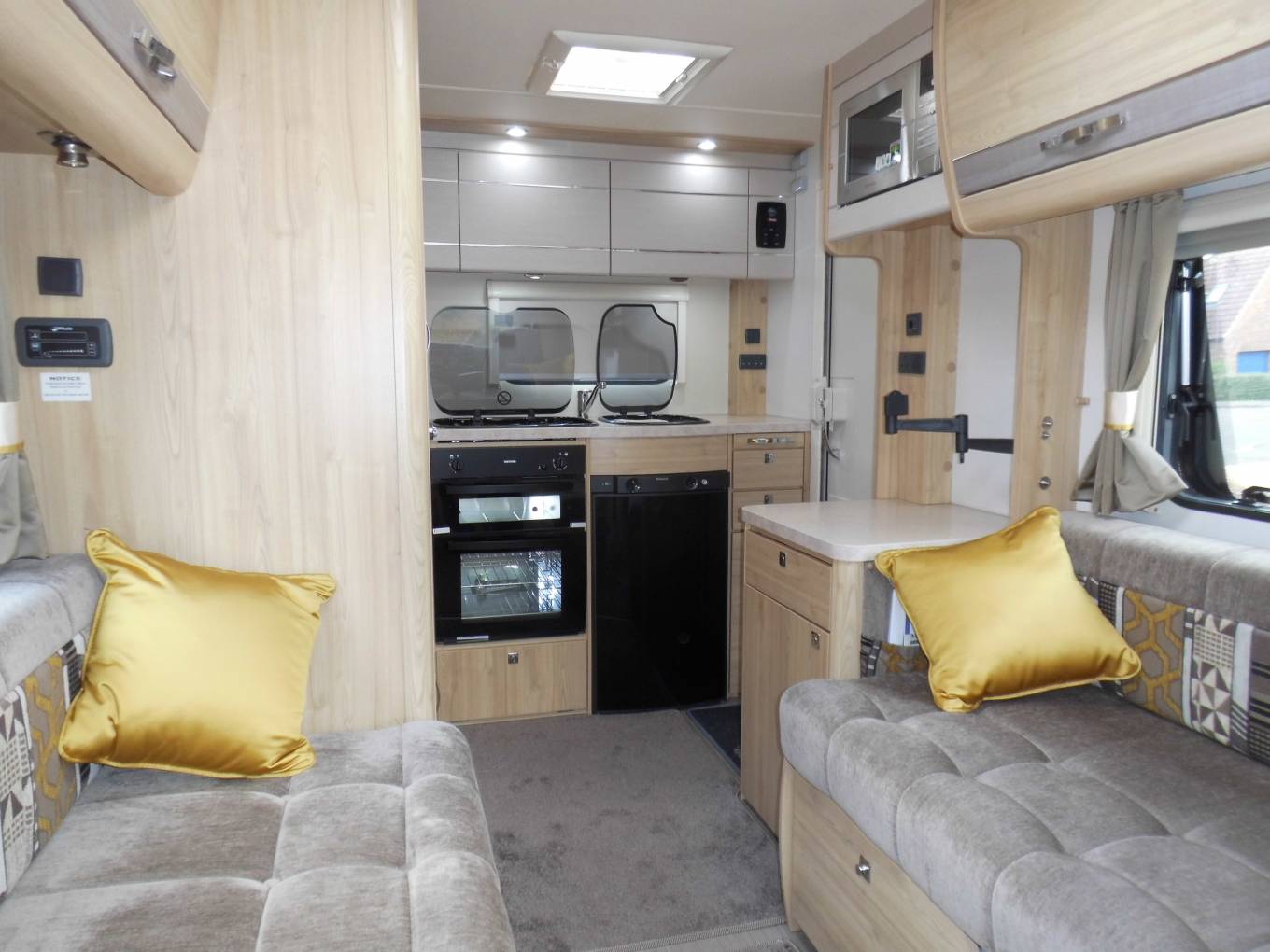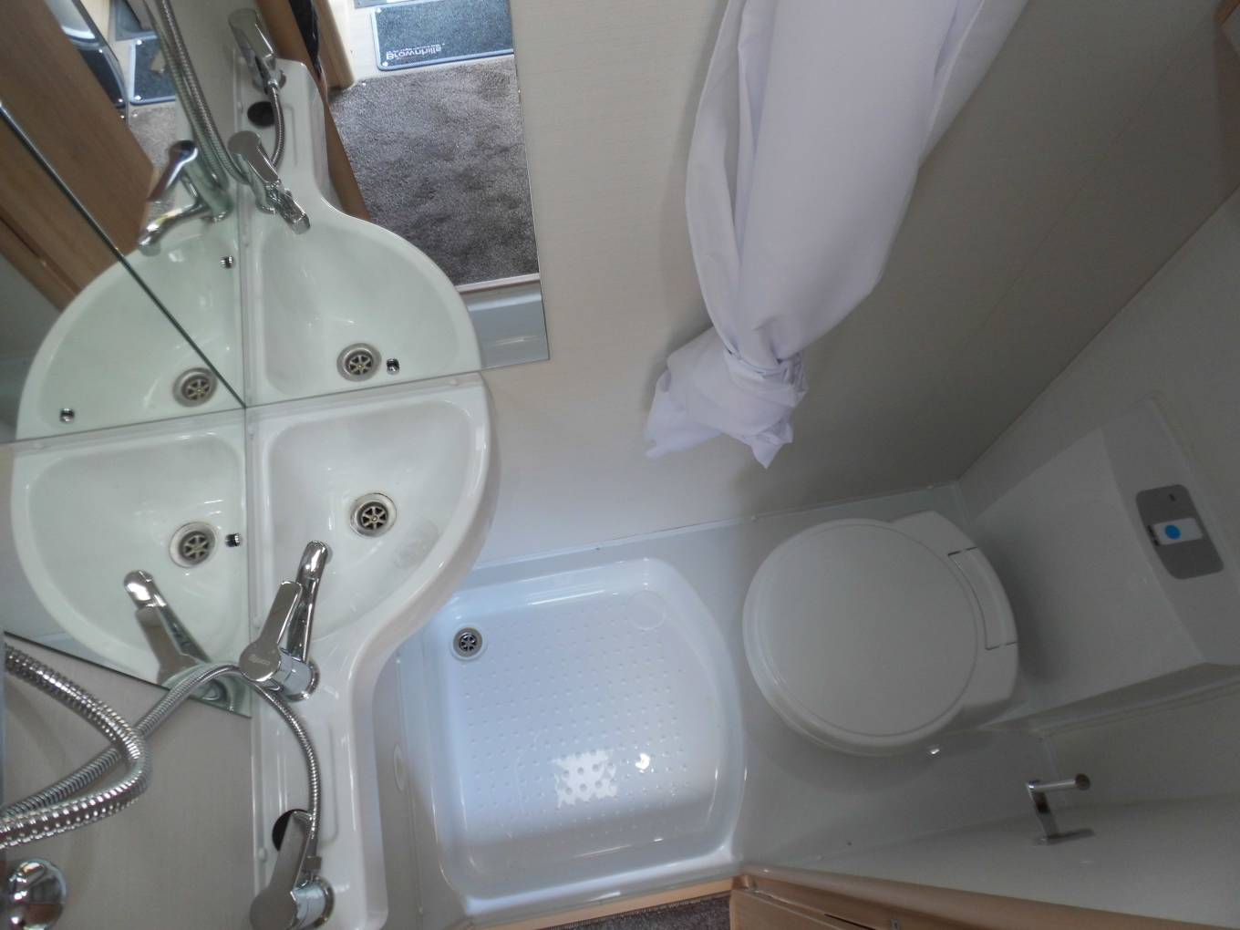 Moving into the modern designed kitchen you will find loads of well-lit functional worktop surfaces, a three gas burner hob, Thetford immaculate separate grill and oven and generous designer stainless sink, above the Dometic combination fridge freezer. Great detailing includes a mains hotplate on the stove, stainless-steel microwave, decent cutlery drawer and generous amounts of cupboard space and a ceiling mounted two-way electric fan. Adjacent is the well appointed corner washroom with integral shower,Thetford cassette toilet, vanity wash basin with mixer tap, mirror and medicine cabinet.