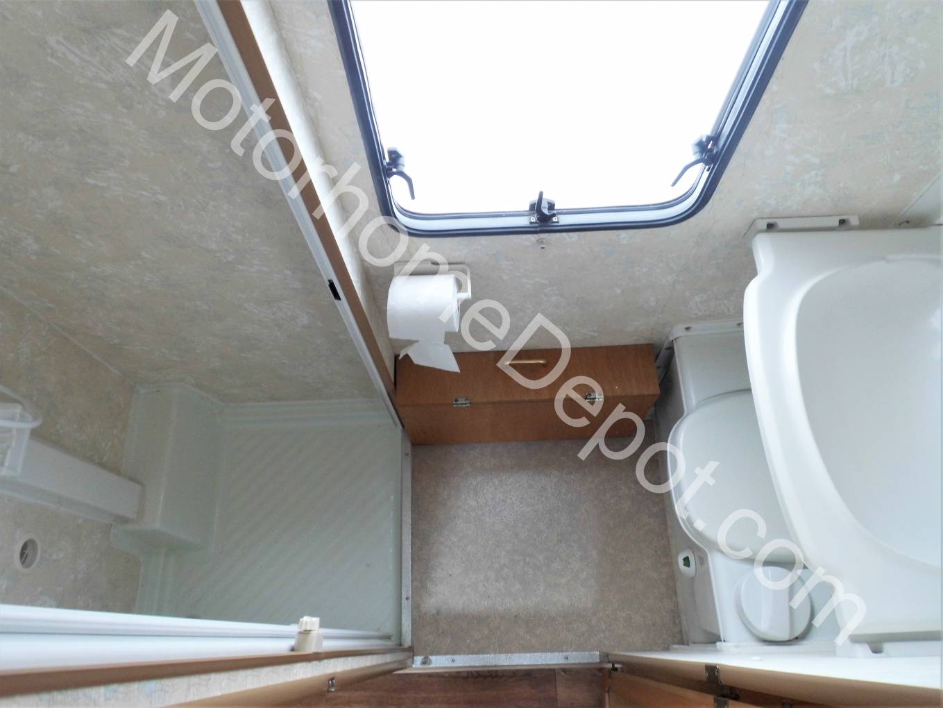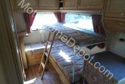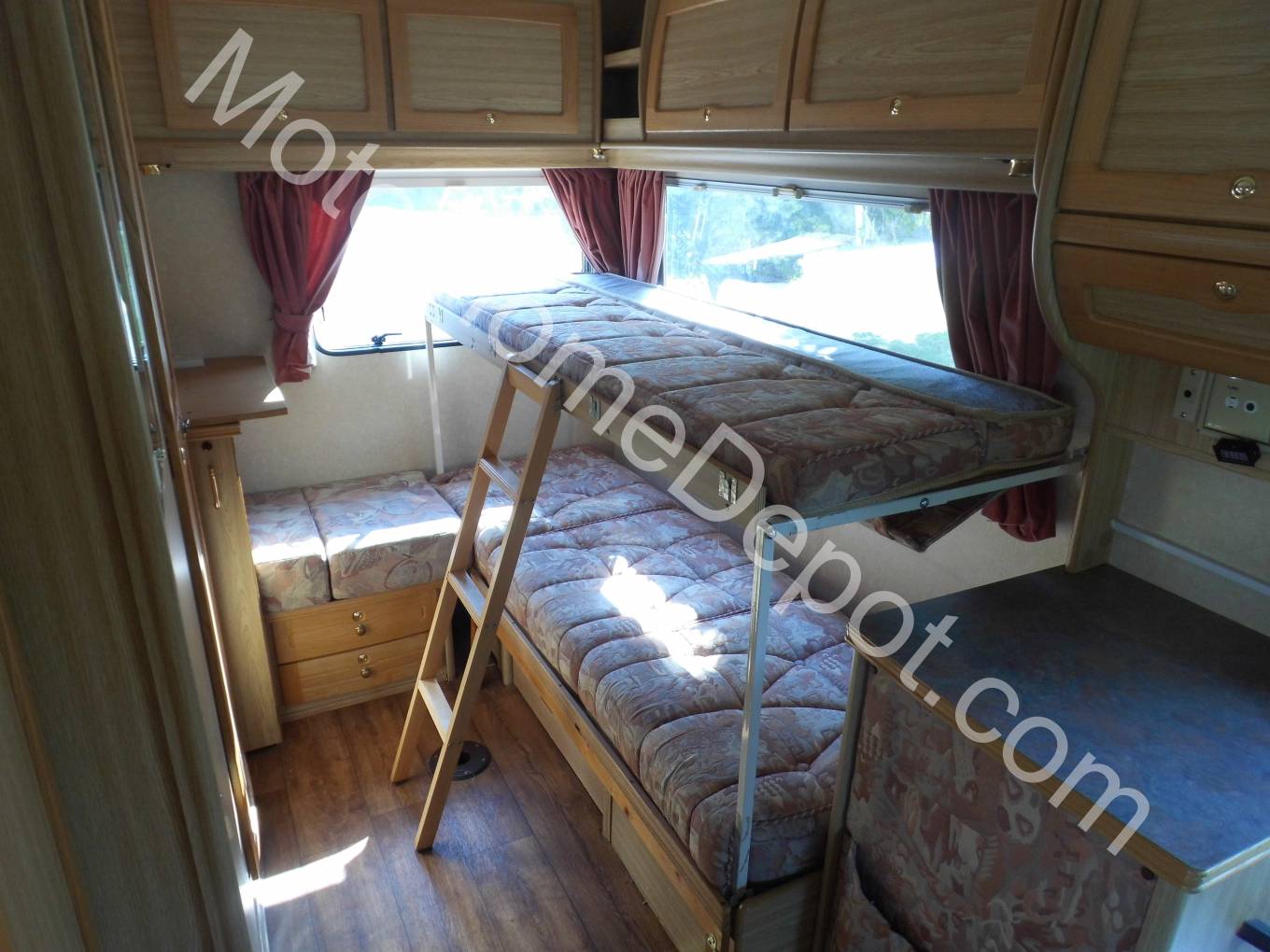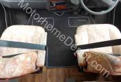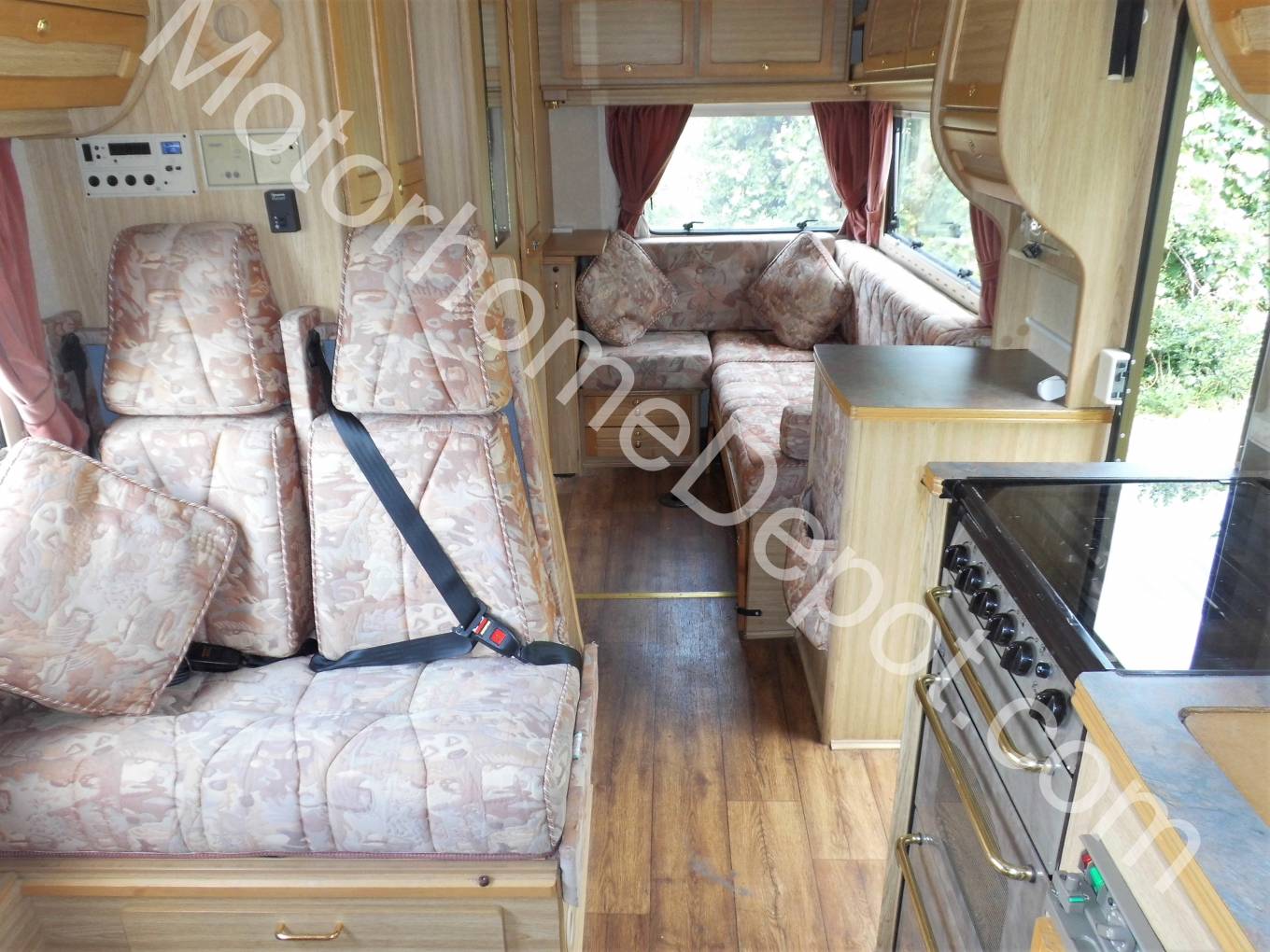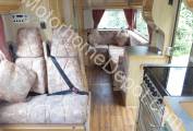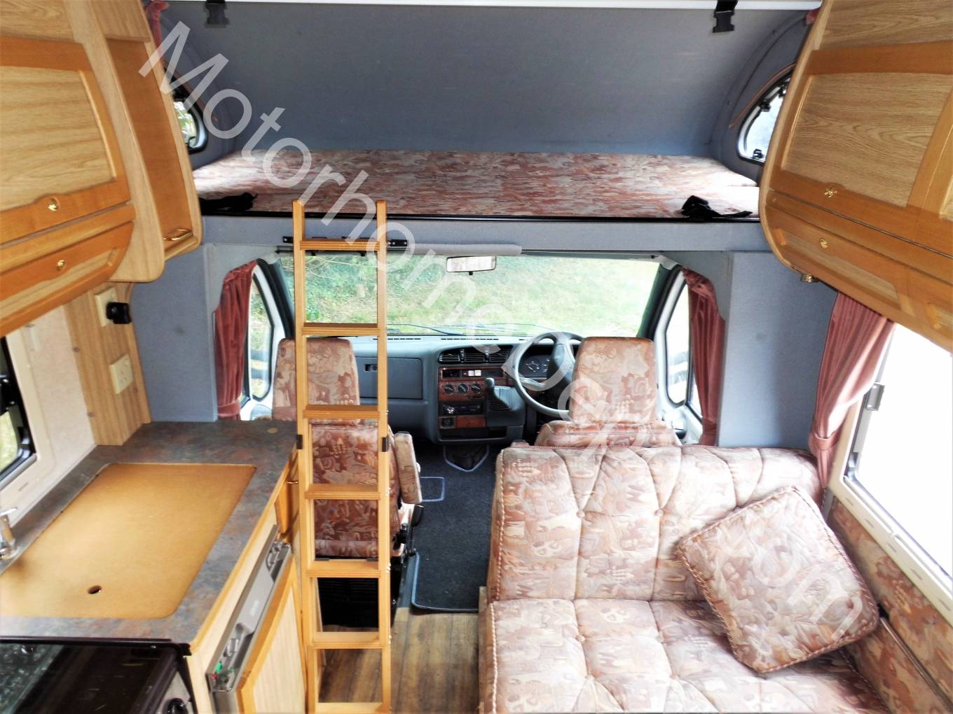 Moving forward to the cab area there is an over-cab double bed with ladder access. The driver and passenger seats both have 3 point seat belts. There are fly and blackout blinds to the habitation area and warm air heating vents also lots of storage