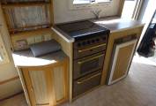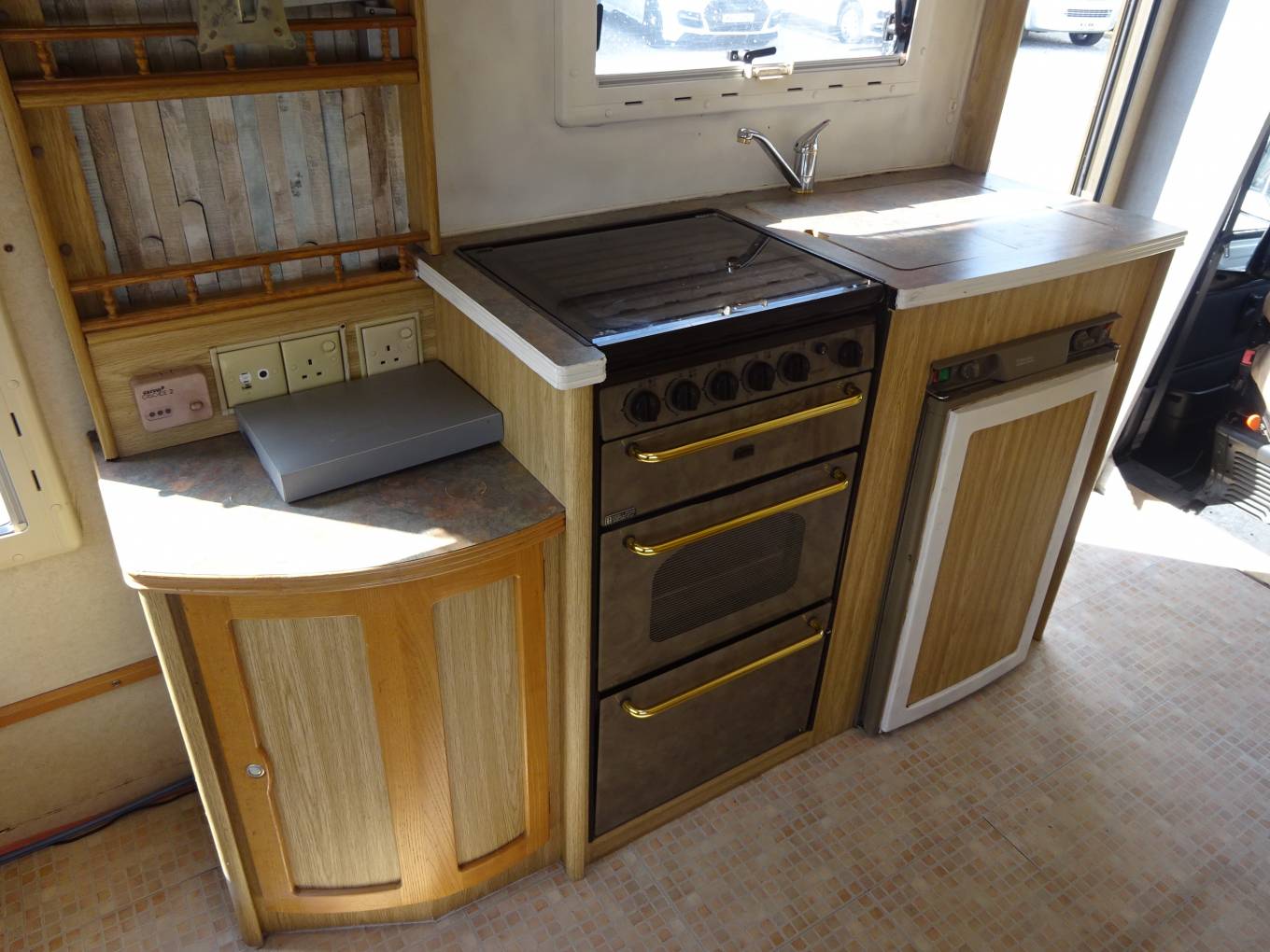 A central kitchen area has full cooker, fridge and sink with drainer.